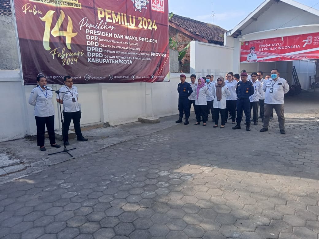 PURWODADI - Senin, 14 Agustus 2023 KPU kabupaten Grobogan menggelar Apel Pagi di halaman kantor KPU Kabupaten Grobogan. Bertugas sebagai pemimpin apel adalah Kasubbag HSDM KPU Kabupaten Grobogan Bapak Rama Eka Saputra, SH. Sementara Anggota KPU Kabupaten Grobogan Divisi Hukum dan Pengawasan Ibu Sulistiyorini, SP mengambil tempat sebagai pembina apel.