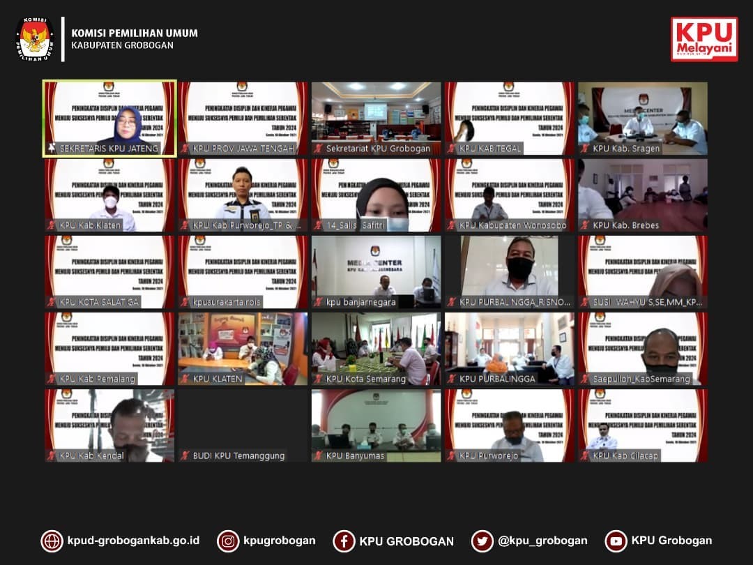 Senin 18 Oktober 2021, KPU Kabupaten Grobogan mengikuti kegiatan pembinaan kepegawaian melalui Peningkatan Disiplin dan Kinerja Pegawai Menuju Sukses Pemilu dan Pemilihan Serentak Tahun 2024 yang diselenggarakan oleh KPU Provinsi Jawa Tengah. Acara yang di laksanakan secara daring ini diikuti oleh Sekretaris, Kasubbag dan seluruh pegawai di lingkungan KPU Kabupaten/Kota se Jawa Tengah.