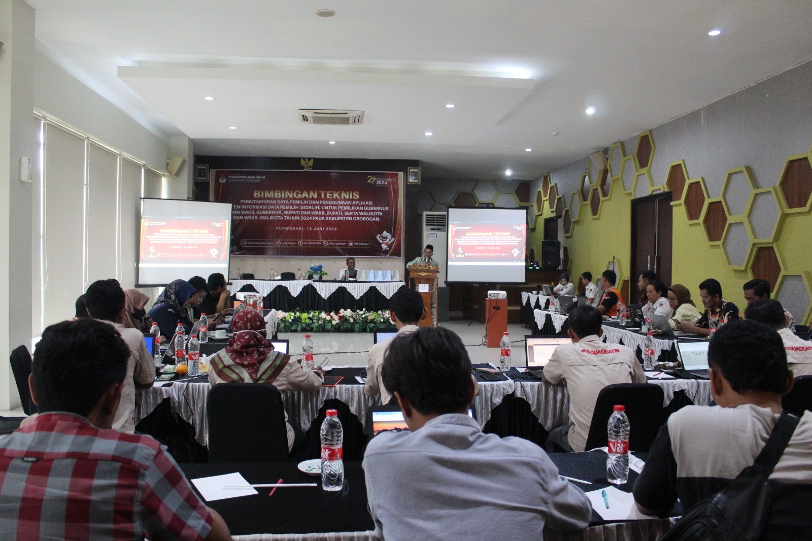 PURWODADI - Kamis (13/6/2024), KPU Kabupaten Grobogan menggelar Bimbingan Teknis Pemutakhiran Data Pemilih dan Penggunaan Aplikasi Sistem Informasi Data Pemilih (Sidalih) Untuk Pemilihan Gubernur dan Wakil Gubernur, Bupati dan Wakil Bupati serta Walikota dan Wakil Walikota Tahun 2024 Pada Kabupaten Grobogan. Kegiatan yang bertempat di Hotel Kyriad Grand Master Purwodadi ini diikuti oleh Anggota PPK Koordinator Pemutakhiran Data se-Kabupaten Grobogan.