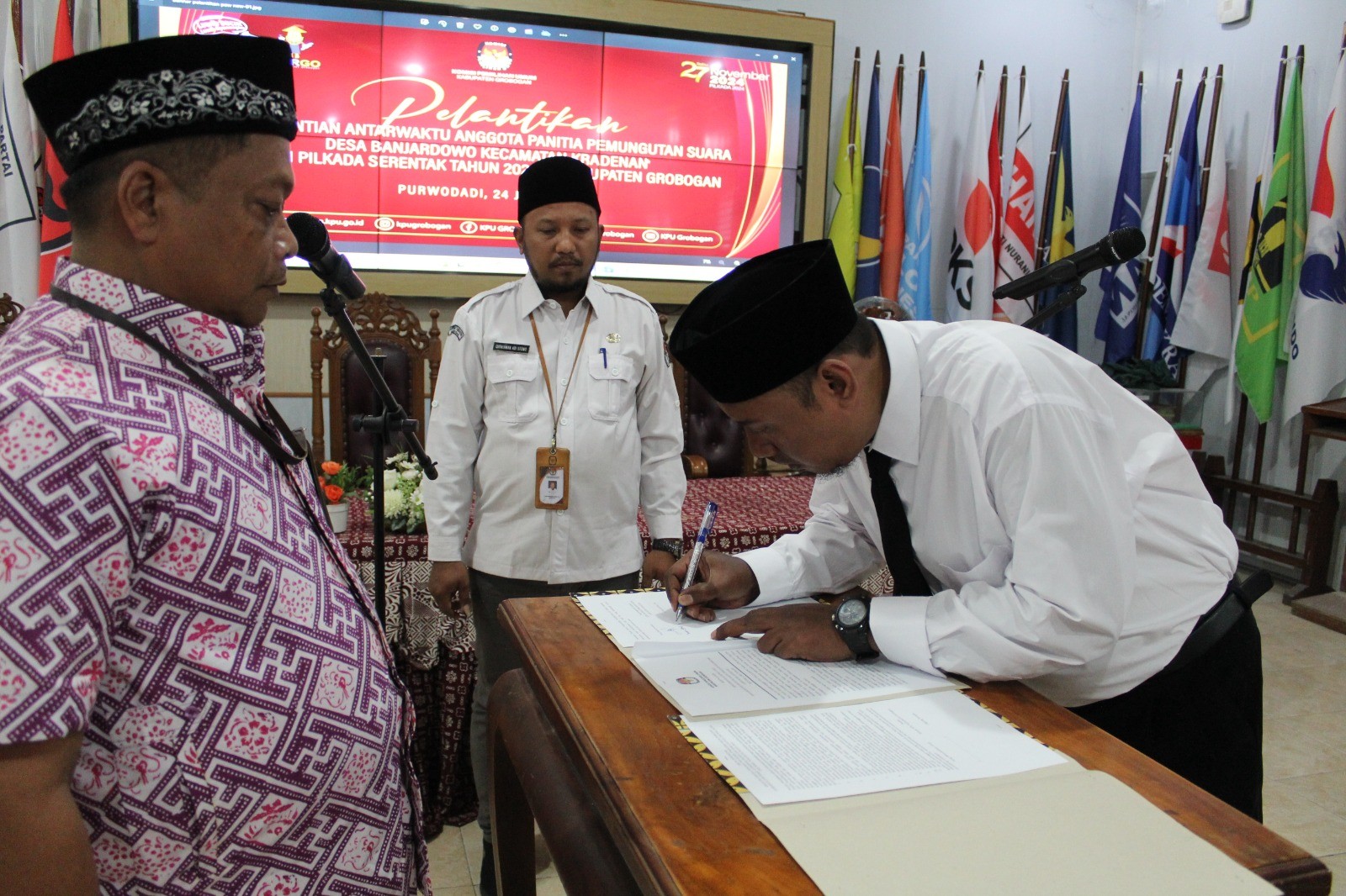 PURWODADI - Hari ini Senin tanggal 24 Juni 2024, bertempat di Aula KPU Kabupaten Grobogan Jl. Letjend. S. Parman No. 2 Purwodadi, digelar Pelantikan sekaligus pengambilan sumpah janji serta penandatanganan pakta integritas Penggantian Antar Waktu Anggota Panitia Pemungutan Suara Desa Banjardowo Kecamatan Kradenan dalam Pilkada Serentak Tahun 2024 di Kabupaten Grobogan, dimana sdr. Iwan Budi Susilo menggantikan sdr. Suyadi yang telah mengundurkan diri.