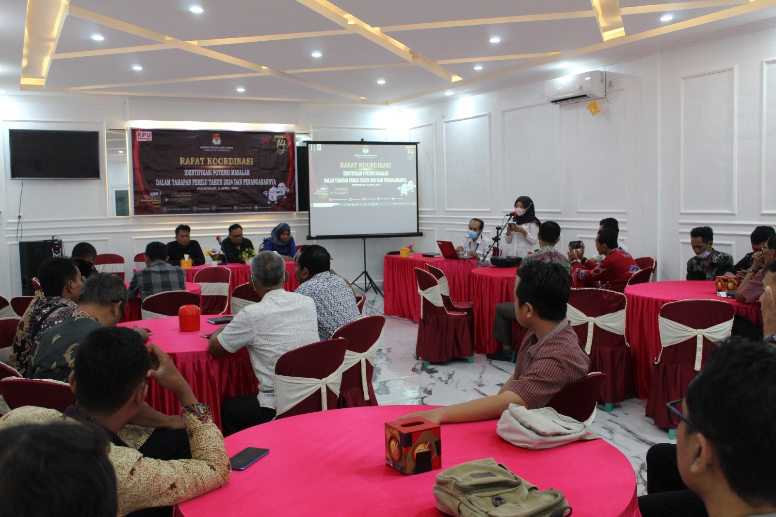 Acara dibuka secara langsung oleh Ketua KPU Kabupaten Grobogan, dan bertindak sebagai narasumber adalah Bapak Muslim Aisha yang saat ini menjabat sebagai Anggota KPU Provinsi Jawa Tengah. Pada pemaparannya, Bapak Muslim Aisha menjelaskan bahwa ada berbagai masalah yang dapat terjadi dalam pelaksanaan tahapan PemiluTahun 2024. Dimana jajaran KPU sebagai penyelenggara teknis harus siap menghadapi masalah-masalah tersebut beiringan dengan berjalannya tahapan emilu Tahun 2024. Tentunya ini membutuhkan perhatian ekstra, karena pada saat tahapan Pemilu Tahun 2024 berlangsung pasti keadaan akan menjadi crowded.