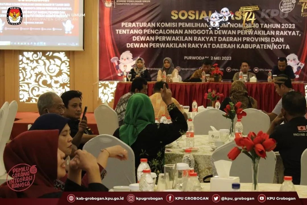 PURWODADI - Selasa, 2 Mei 2023 KPU Kabupaten Grobogan menggelar Sosialisasi Peraturan Komisi Pemilihan Umum Nomor 10 Tahun 2023 tentang Pencalonan Anggota Dewan Perwakilan Rakyat, Dewan Perwakilan Rakyat Daerah Provinsi Dan Dewan Perwakilan Rakyat Daerah Kabupaten/Kota bertempat di Hotel 21 Purwodadi, Jl. MT Haryono No. 137 Purwodadi.