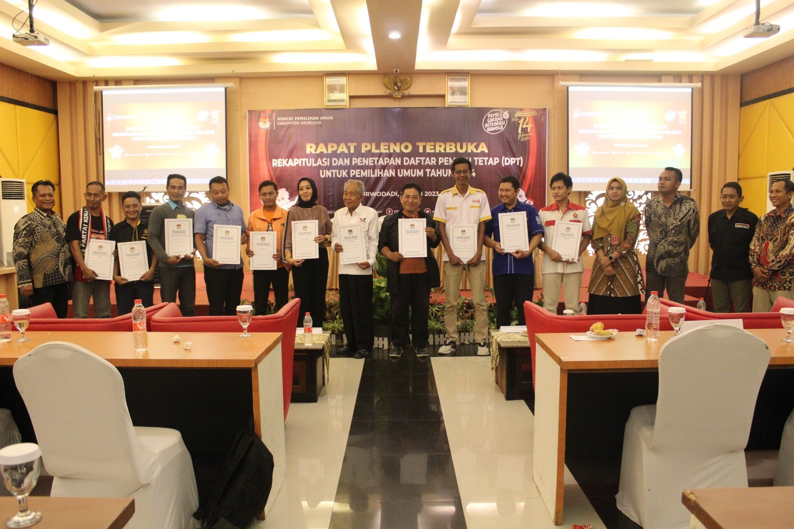 Rapat Pleno Terbuka Rekapitulasi Daftar Pemilih Tetap (DPT) Untuk Pemilu Tahun 2024 menghasilkan DPT sebesar 1.125.968 pemilih, yang terdiri dari 560.536 pemilih laki-laki dan 565.432 pemilih perempuan.Hasil dari Rapat Pleno Terbuka Rekapitulasi Daftar Pemilih Tetap (DPT) Untuk Pemilu Tahun 2024 diserahkan secara langsung kepada stakeholder terkait dan Partai Politik peserta Pemilu tahun 2024 di tingkat Kabupaten Grobogan.