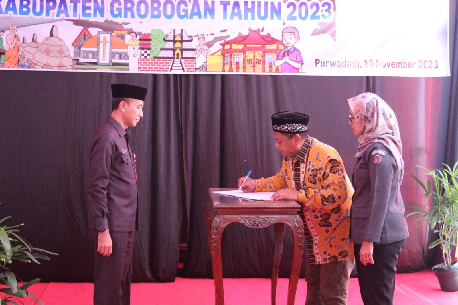 PURWODADI - Jum'at (10/11/2023) bertempat di Halaman Kantor Badan Kesbangpol Kabupaten Grobogan, Ketua KPU Kabupaten Grobogan, Bapak Agung Sutopo, S.Pi menandatangani Naskah Perjanjian Hibah Daerah (NPHD) Pemilihan Kepala Daerah Tahun 2024. Penandatanganan dilakukan bersamaan dengan kegiatan Pencanangan Kampung Bhinneka dan Launching Rumah Kebangsaan Kabupaten Grobogan Tahun 2023.