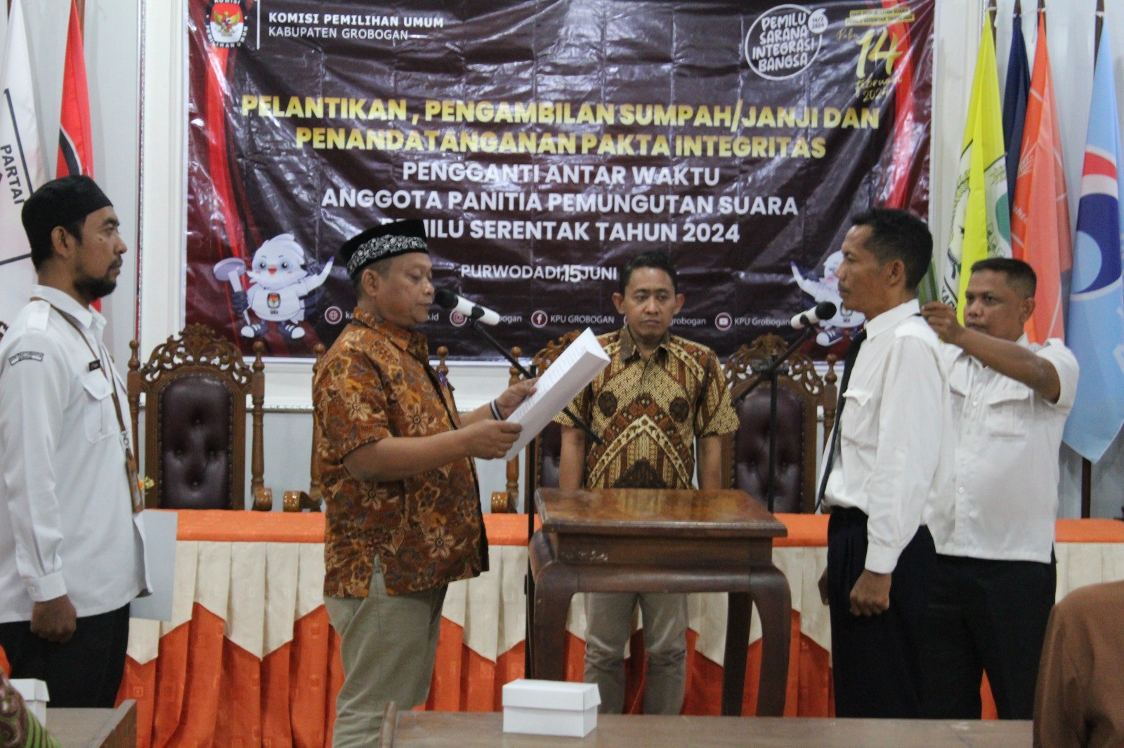 Dalam sambutannya Suwikyo mengucapkan terima kasih kepada Partai Politik di tingkat Kabupaten Grobogan karena telah bekerja keras untuk bersama-sama menyelesaikan tahapan pendaftaran, verifikasi dan penetapan Partai Politik ini bersama KPU Kabupaten Grobogan. Selanjutnya Suwiknyo juga menyampaikan bahwa kedepannya di setiap tahapan, KPU akan menggunakan teknologi informasi, sehinga beliau mengharapkan Partai Politik juga menyiapkan sarana dan sumber daya yang memadai. Dalam materinya, Suwiknyo memaparkan beberapa hal terkait tahapan pendaftaran, verifikasi dan penetapan Partai Politik.