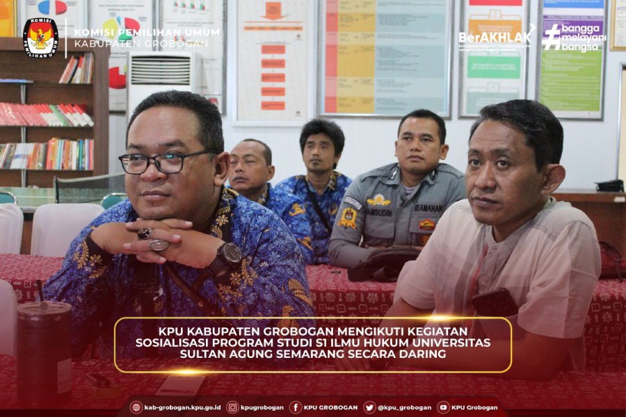 Hai #TemanPemilih, bertempat di aula, Jumat (17/10/2025), KPU Kabupaten Grobogan mengikuti kegiatan Sosialisasi Program Studi S1 Ilmu Hukum Universitas Sultan Agung Semarang. Kegiatan yang diselenggarakan secara daring oleh KPU Provinsi Jawa Tengah ini berkolaborasi dengan Fakultas Hukum Universitas Sultan Agung (Unissula) Semarang, dan diikuti oleh seluruh KPU Kabupaten/Kota se-Jawa Tengah. Dalam kesempatan tersebut, Kabag Teknis Penyelenggaraan Pemilu dan Parhumas KPU Provinsi Jawa Tengah, Dewantoputra Adhipermana, menyampaikan bahwa KPU sebagai organisasi modern senantiasa berupaya meningkatkan kompetensi sumber daya manusianya. Salah satu upaya tersebut adalah melalui program tugas belajar, baik melalui kedinasan maupun secara mandiri. Ia menambahkan, kegiatan ini juga menjadi bagian dari komitmen KPU di masa pasca pemilu (post election) untuk mendorong peningkatan kompetensi dan inovasi. Serangkaian kegiatan diisi dengan penyampaian materi oleh Dini Amalia Fitri dari Universitas Sultan Agung Semarang yang memaparkan Profil dan Penerimaan Mahasiswa Baru (PMB) Fakultas Hukum Unissula yang telah terakreditasi Unggul. Terlihat antusiasme para peserta mengikuti kegiatan ini. Sosialisasi ini menjadi salah satu upaya berkelanjutan KPU Provinsi Jawa Tengah dalam rangka peningkatan kompetensi dan kualitas SDM di lingkungan penyelenggara pemilu.