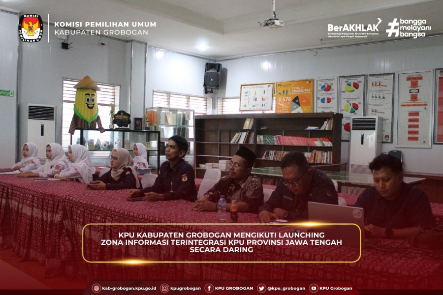 Hai #TemanPemilih, KPU Kabupaten Grobogan mengikuti Launching Zona Informasi Terintegrasi KPU Provinsi Jawa Tengah, bertempat di Aula Kantor KPU Kabupaten Grobogan secara daring, Selasa (1/7/2025). Kegiatan diawali sambutan oleh Ketua KPU Provinsi Jawa Tengah, Handi Tri Ujiono. Disampaikan bahwa kegiatan hari ini adalah ikhtiar dari tim agen perubahan KPU Provinsi Jawa Tengah dalam mengimplementasikan dan memperkuat nilai-nilai integritas dalam setiap aspek budaya kerja dan juga memastikan bahwa prinsip-prinsip zona integritas bertujuan untuk menciptakan lingkungan yang bersih, transparan, dan akuntabel serta meningkatkan kualitas pelayanan publik sebagaimana core bisnis KPU yaitu KPU Melayani. Hal ini mendasari bahwa KPU berkomitmen menciptakan pusat layanan informasi guna memastikan bahwa layanan publik yang disediakan secara gratis, efisien, efektif, ramah, modern, mudah aksesible, interaktif, dan user friendly, dan adil untuk memenuhi kebutuhan masyarakat untuk berbagai kepentingan, jelas Handi Turut memberikan apresiasi dalam kegiatan ini Muslim Aisha selaku Anggota KPU Provinsi Jawa Tengah Kadiv Hukum dan Pengawasan. Hari ini kami patut bersyukur bisa melaunching satu inovasi baru, satu gagasan baru mengenai banyaknya layanan publik yang terintegrasi jadi satu yang kita sebut sebagai Zona Informasi Terintegrasi. Prinsipnya sederhana, kami ingin lebih mendekatkan diri kepada masyarakat, terutama kebutuhan-kebutuhan layanan itu. Mungkin dari zona integrasi dan informasi ini semua yang ingin diketahui oleh masyarakat bahkan untuk kebutuhan riset sekalipun itu bisa dimanfaatkan di Zona Informasi Terintegrasi, ungkap Muslim. Kegiatan dilanjutkan dengan penyematan kaos secara simbolis yang merupakan lambang dari Zona Informasi Terintegrasi yang kemudian dilanjutkan arahan dan pembukaan oleh Anggota KPU RI, Iffa Rosita. Dalam arahannya disampaikan 6 area perubahan yang harus dilakukan KPU dalam membangun zona integritas yang meliputi manajemen perubahan, penataan tata laksana, penataan sistem manajemen sumber daya manusia, penguatan akuntabilitas, penguatan pengawasan, dan peningkatan kualitas pelayanan publik. Terdapat juga penyampaian materi mengenai Potret Pengawasan di Wilayah Provinsi Jawa Tengah Tahun 2024-2025 di penghujung acara oleh Iffa Rosita.