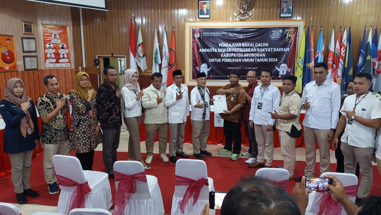 PURWODADI - Minggu, 14 Mei 2023 pukul 15.49 WIB, Partai Persatuan Indonesia (Perindo) datang ke kantor KPU Kabupaten Grobogan dengan membawa berkas pengajuan bakal calon Anggota DPRD Kabupaten yang sebelumnya telah diunggah di Sistem Informasi Pencalonan (SILON). Hadir pada saat itu adalah Ketua Partai Perindo tingkat Kabupaten Grobogan Bapak G. Wahyu H. bersama Petugas Penghubung (LO) Perindo bapak Djoko Leewo M. . Kehadiran Partai Perindo diterima dengan hangat oleh Ketua KPU Kabupaten Grobogan. Setelah menyematkan cindera mata, Agung Sutopo, secara resmi menyambut rombongan Partai Perindo. Berkesempatan menyambut rombongan Partai Perindo adalah Anggota KPU Kabupaten Grobogan Divisi Teknis Penyelenggaraan Suwiknyo S.Pd. I. Dalam sambutannya, Suwiknyo mengucapkan apresiasi kepada Partai Perindo karena telah berhasil menyelesaikan tahapan pendaftaran pengajuan bakal calon Anggota DPRD Kabupaten, beliau juga berharap semoga tahapan ini bisa berjalan lancar hingga penetapan DCT. Sementara Wahyu berharap, dengan proses pengajuan bakal calon Anggota DPRD ini Partai Perindo dapat turut serta meramaikan pesta demokrasi yang akan digelar tahun 2024 mendatang, tak lupa Wahyu mengucapkan terimakasih kepada KPU Kabupaten Grobogan atas penyambutan yang dilakukan. Setelah dokumen pengajuan bakal calon Anggota DPRD Kabupaten Grobogan diterima oleh Ketua KPU Kabupaten Grobogan, untuk kemudian dilakukan pemeriksaan, dan dinyatakan lengkap. Berita Acara dan Tanda Terima Penerimaan Berkas Pengajuan diserahkan oleh Suwiknyo, kepada Sekretaris Partai Perindo tingkat Kabupaten Grobogan.
