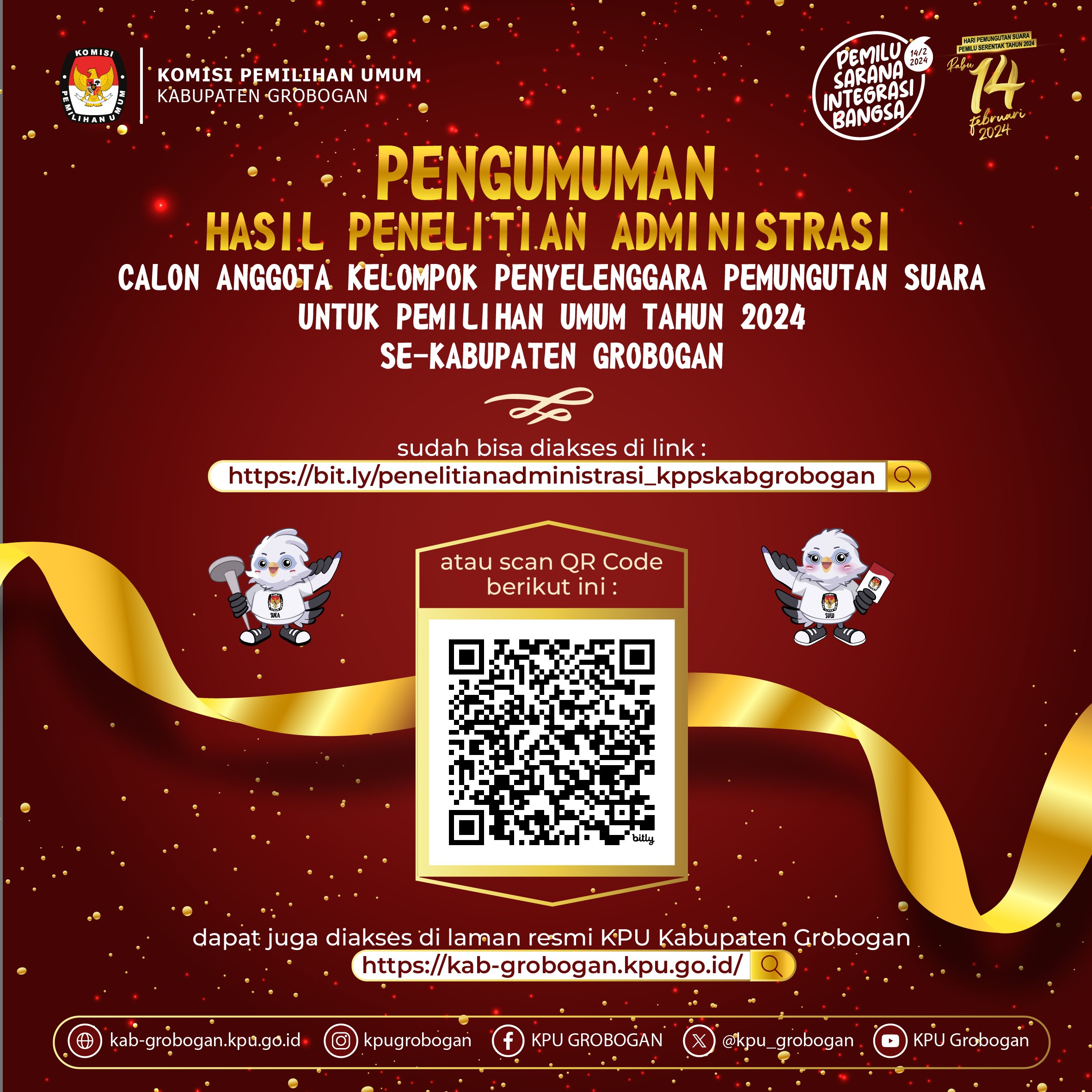 Berikut Kami sampaikan Pengumuman Nomor : 303/PP.04.1-Pu/3315/2023 tentang Hasil Penelitian Administrasi Calon Anggota Kelompok Penyelenggara Pemungutan Suara Untuk Pemilihan Umum Tahun 2024 Se-Kabupaten Grobogan yang dapat diakses di sini
