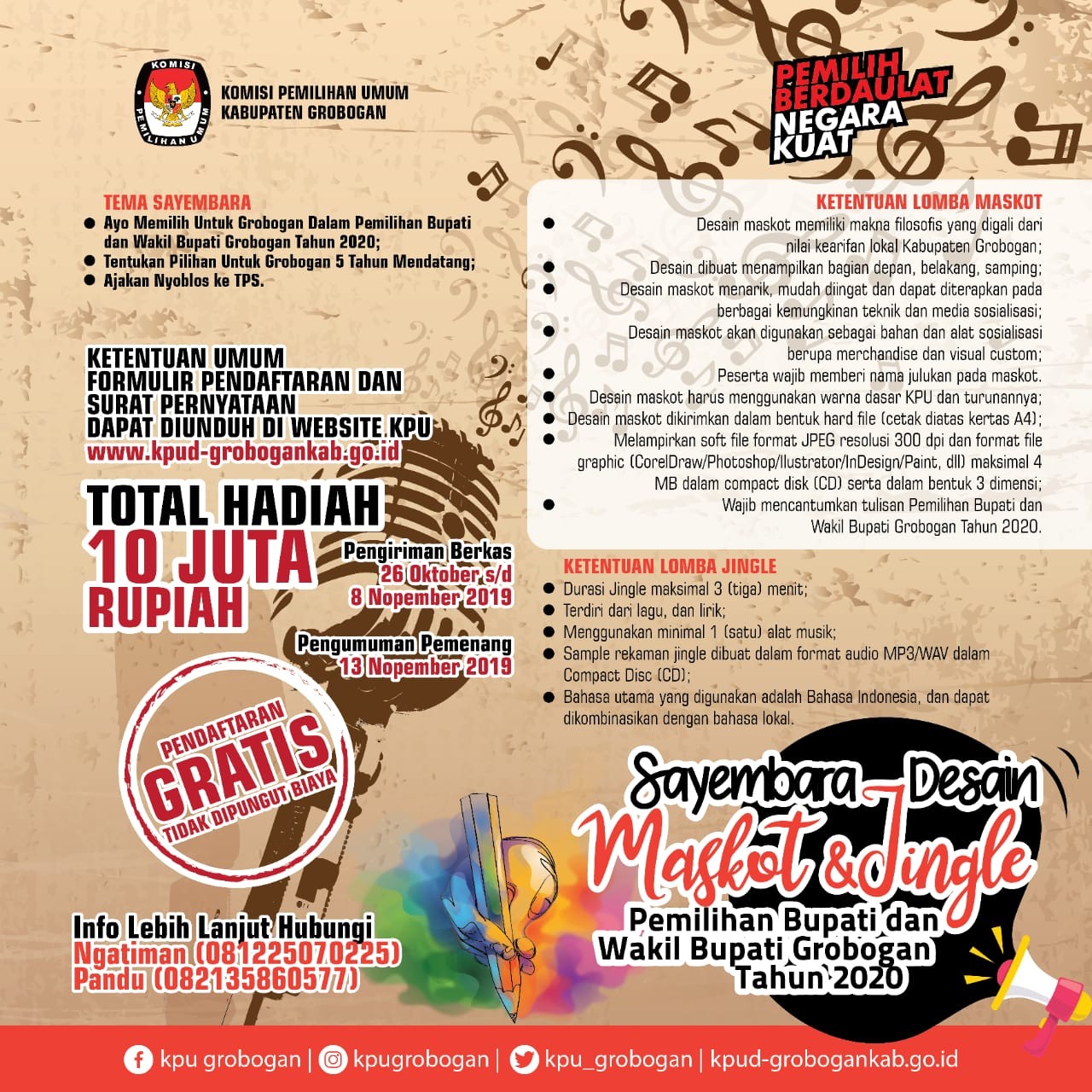 Dalam rangka memeriahkan Pilkada Serentak Tahun 2020 di Kabupaten Grobogan,KPU Kab. Grobogan mengadakan sayembara cipta maskot dan jingle Pilkada Serentak… Cermati syaratnya, ikuti sayembara, dan menangkan hadiah puluhan juta rupiah…