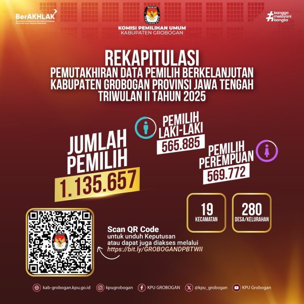 Hai #TemanPemilih, Berikut kami sampaikan Rekapitulasi Pemutakhiran Data Pemilih Berkelanjutan Kabupaten Grobogan Provinsi Jawa Tengah Triwulan II Tahun 2025, berdasarkan Keputusan KPU Kabupaten Grobogan Nomor 4 Tahun 2025 tentang Penetapan Rekapitulasi Pemutakhiran Data Pemilih Berkelanjutan Kabupaten Grobogan Provinsi Jawa Tengah Triwulan II Tahun 2025.