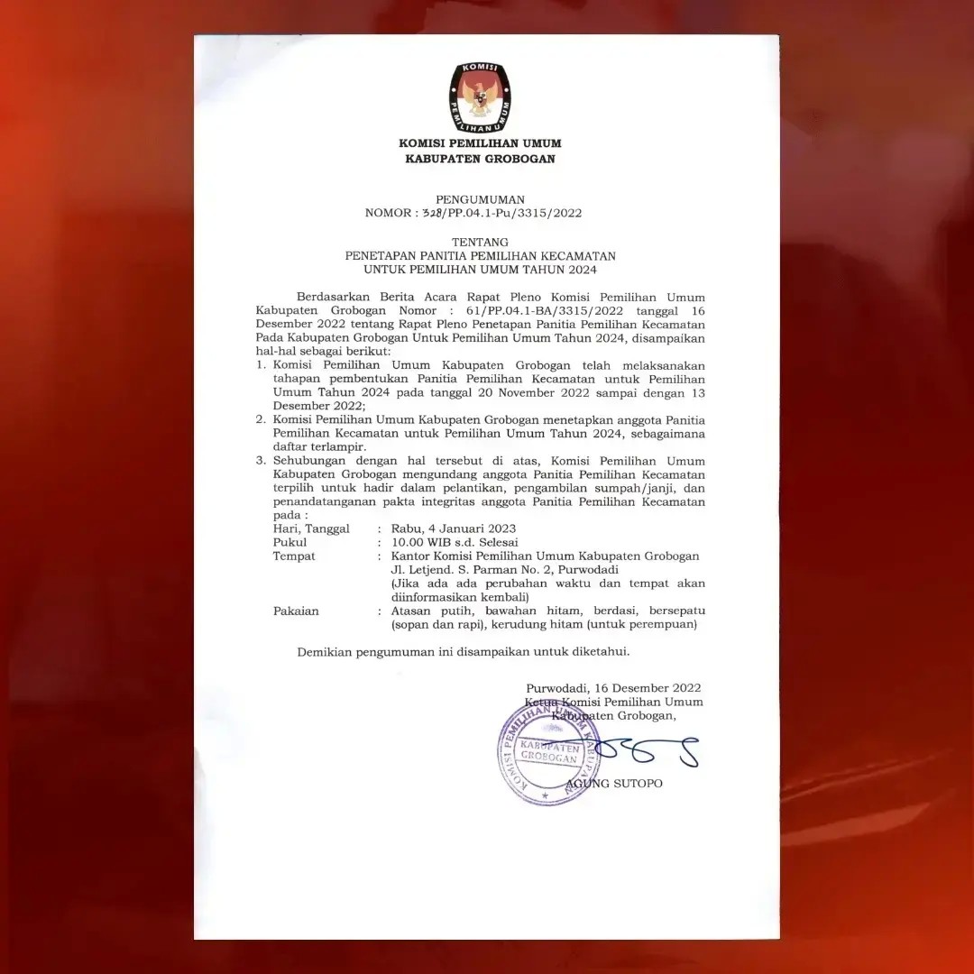 Pengumuman Perpanjangan Pendaftaran Seleksi Calon Anggota Panitia Pemungutan Suara Untuk Pemilihan Umum Serentah Tahun 2024 KPU Kabupaten Grobogan Sabtu, 31 Desember 2022 07:00 286 Pengumuman Perpanjangan Pendaftaran Seleksi Calon Anggota Panitia Pemungutan Suara Untuk Pemilihan Umum Serentah Tahun 2024 KPU Kabupaten Grobogan. Unduh Baca Selengkapnya
