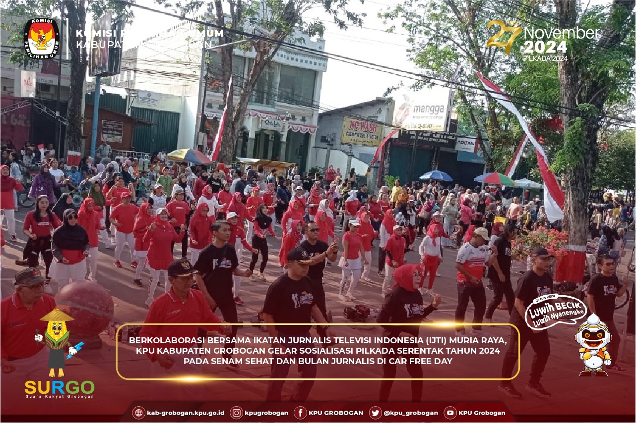 Hai #temanpemilih, berkolaborasi bersama Ikatan Jurnalis Televisi Indonesia (IJTI) Muria Raya, KPU Kabupaten Grobogan gelar kegiatan Sosialisasi Pilkada Serentak Tahun 2024 pada Senam Sehat dan Bulan Jurnalis di Car Free Day, Minggu (11/8/2024).