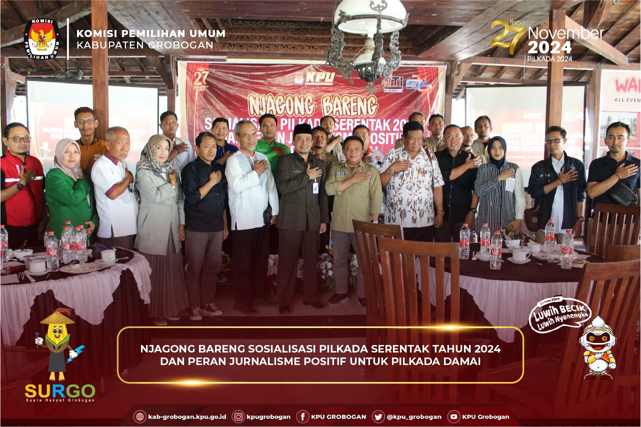 Dalam sambutannya Ketua KPU Kabupaten Grobogan, Bapak Agung Sutopo, S.Pi menyampaikan bahwa kegiatan ini adalah wujud sinergitas antara KPU Kabupaten Grobogan dengan media dalam rangka sosialisasi Pilkada 2024. Selamat Ulang Tahun IJTI Menuju Jurnalisme Positif, ucap Beliau. Beliau berharap kedepan sinergi ini agar tetap terjalin sehingga sosialisasi tahapan Pilkada 2024 dapat tersampaikan ke masyarakat dengan baik. Di akhir sambutan disampaikan ajakan kepada seluruh warga masyarakat Grobogan untuk datang ke TPS, menggunakan hak pilihnya pada Pilkada 2024 pada hari Rabu, 27 November 2024. Beliau menghimbau untuk menyampaikan kepada PPS, PPK atau KPU Kabupaten Grobogan apabila ada warga masyarakat Grobogan yang telah memenuhi syarat namun belum terdaftar sebagai pemilih dalam Pilkada 2024.
