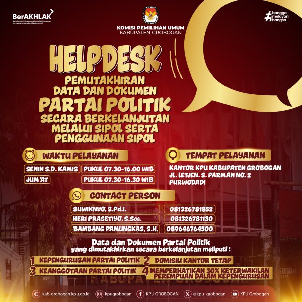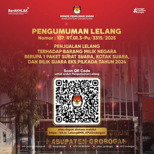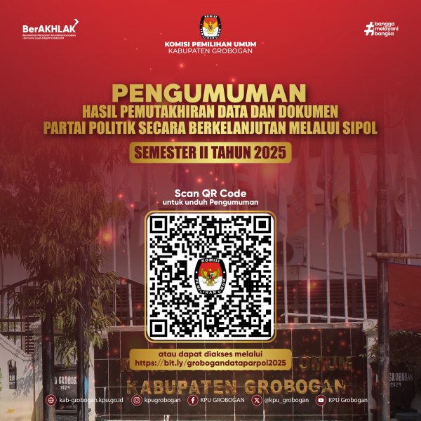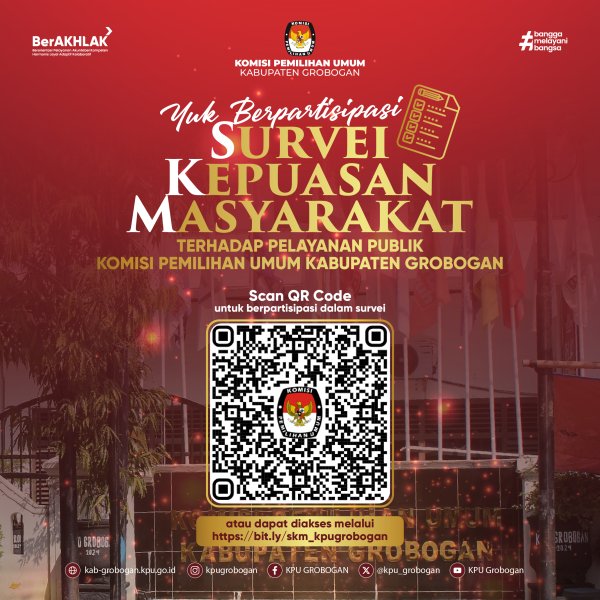 Menindaklanjuti Surat Dinas Sekretaris Jenderal KPU Republik Indonesia Nomor 2544/ORT.07-SD/01/2025 Tanggal 28 Juli 2025 Perihal Pelaksanaan Survei Kepuasan Masyarakat (SKM), untuk peningkatan kualitas layanan KPU Kabupaten Grobogan pada triwulan II / Semester I Tahun 2025. Mohon #TemanPemilih dapat meluangkan waktu untuk mengisi kuesioner survei kepuasan layanan dengan scan barcode diatas atau klik tautan berikut ini :