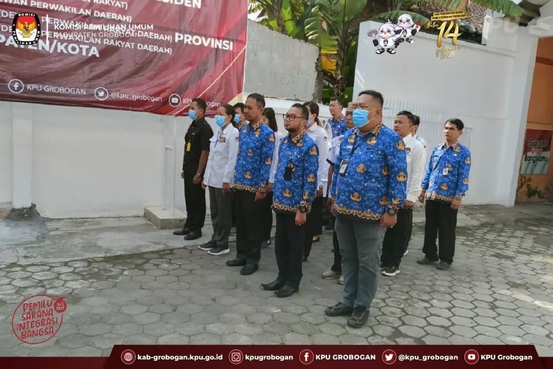 PURWODADI - Bertempat di halaman kantor KPU Kabupaten Grobogan, tepat pukul 08.00 WIB KPU Kabupaten Grobogan menggelar apel pagi. Bertindak sebagai pembina apel kali ini adalah Sekretaris KPU Kabupaten Grobogan Ibu Yudhaviska AS, SE, MH, dan bertugas sebagai pemimpin apel adalah Kasubbag Hukum dan SDM Sekretariat KPU Kabupaten Grobogan Bapak Rama Eka Saputra, SH.