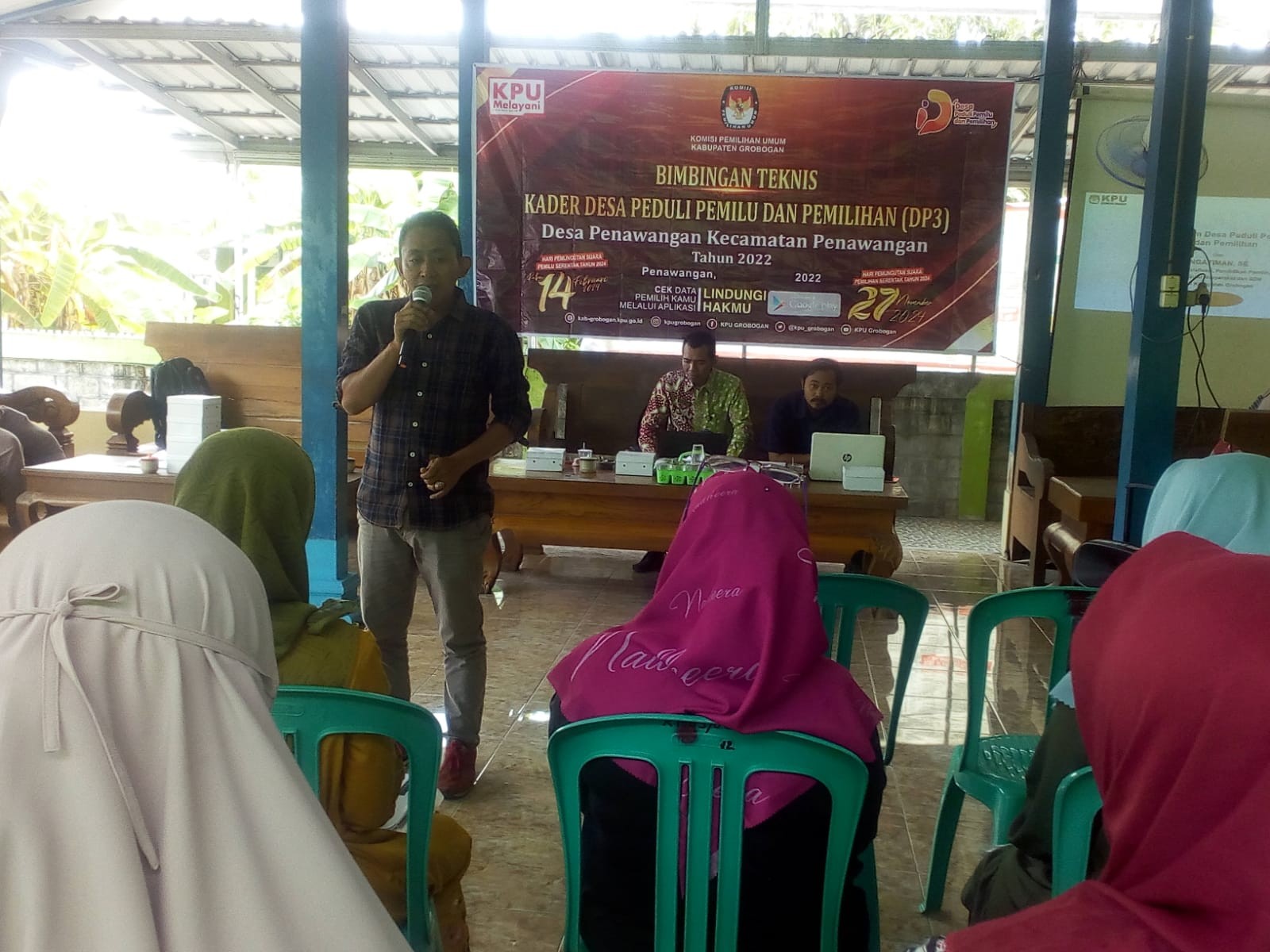 Hadir dalam Bimtek ini 25 kader Desa Peduli Pemilu dan Pemilihan (DP3) dari masing-masing basis. Pemateri pertama adalah Anggota Komisi Pemilihan Umum Kabupaten Grobogan Divisi Sosialisasi, Pendidikan Pemilih, Partisipasi Masyarakat dan SDM Ngatiman, SE dengan materi Desa Peduli Pemilu dan Pemilihan (DP3) serta Sistem dan Tahapan Pemilu dan Pemilihan. Kemudian dilanjutkan oleh pemateri kedua yaitu dari Bakesbangpol Kabupaten Grobogan Muflih Yusuf dengan materi yaitu Pendidikan Politik Dalam Pencegahan Politik Uang. Materi terakhir disampaikan oleh Perwakilan IJTI Kabupaten Grobogan Suswanto Putro yaitu Teknik dan Identifikasi Berita Bohong (Hoaks).