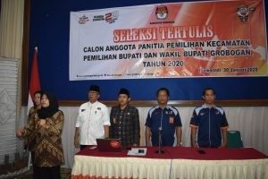 Gedung PGRI hari ini tampak ramai dipadati peserta seleksi calon anggota PPK Pilbup Grobogan 2020. Mereka berbondong-bondong datang dari 19 kecamatan di seluruh Kab. Grobogan. Seleksi tertulis dilaksanakan mulai pukul 10.00 WIB. Dibuka oleh Ketua KPU Kab. Grobogan Agung Sutopo, S. Pi dan dilanjutkan dengan pembacaan tata tertib oleh Ngatiman, SE.
