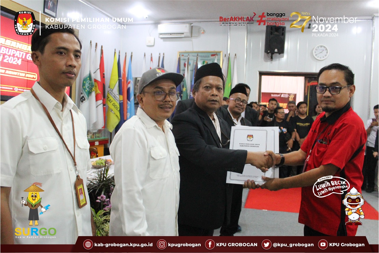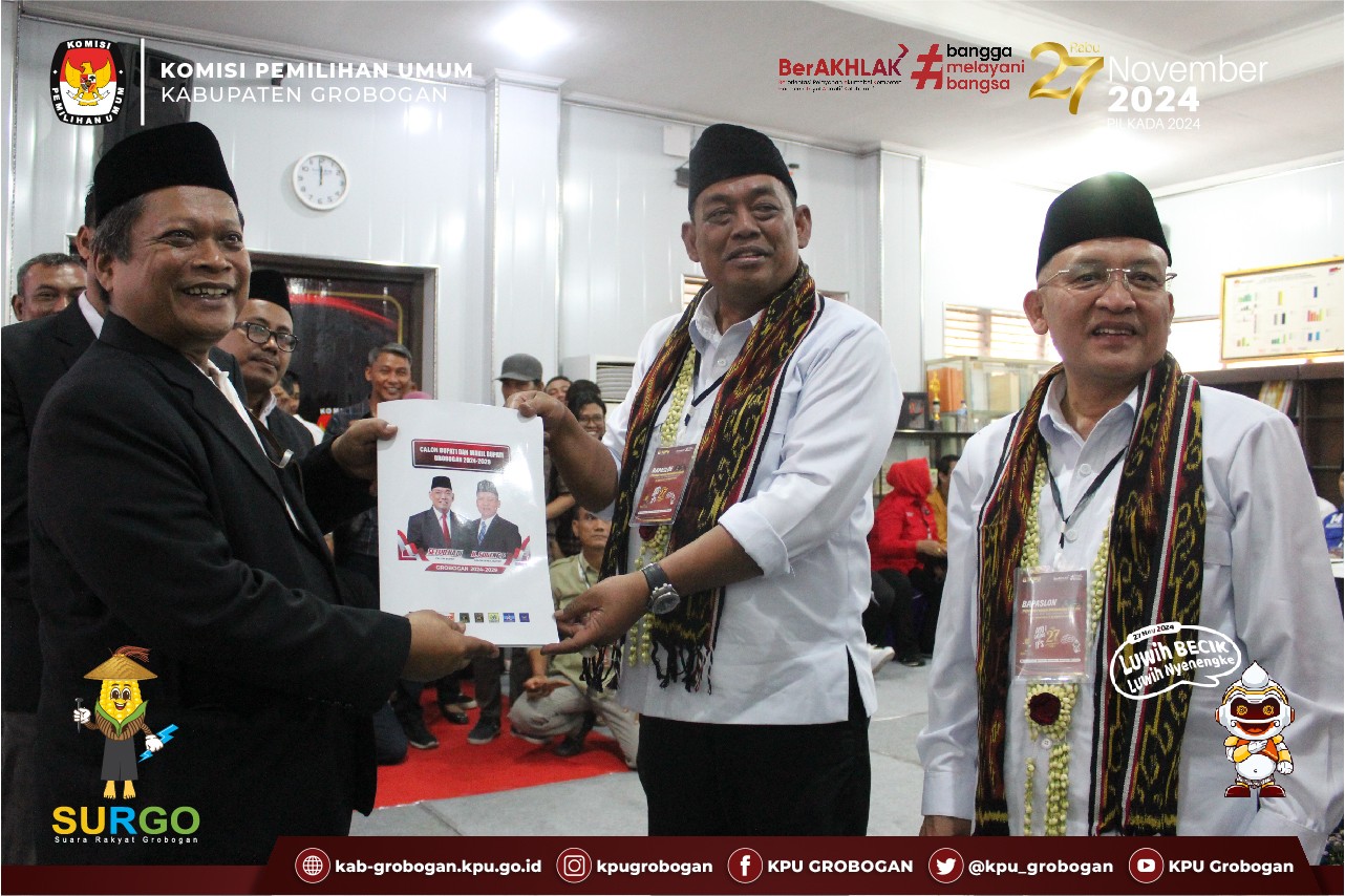 Hai #temanpemilih, di hari ke-2 Pendaftaran Bakal Pasangan Calon Bupati dan Wakil Bupati Grobogan Tahun 2024, KPU Kabupaten Grobogan menerima Pendaftaran Bakal Pasangan Calon Bupati dan Wakil Bupati Grobogan Tahun 2024 atas nama Setyo Hadi dan H. Sugeng Prasetyo, S.E., M.M., Rabu (28/8/2024), yang hadir beserta Ketua/Perwakilan Partai Politik Pengusul yang terdiri dari Partai Demokrasi Indonesia Perjuangan, Partai Demokrat, Partai Gerakan Indonesia Raya, Partai Golongan Karya, Partai Hati Nurani Rakyat, Partai Keadilan Sejahtera, Partai Nasdem, Partai Persatuan Pembangunan dan Partai Solidaritas Indonesia.