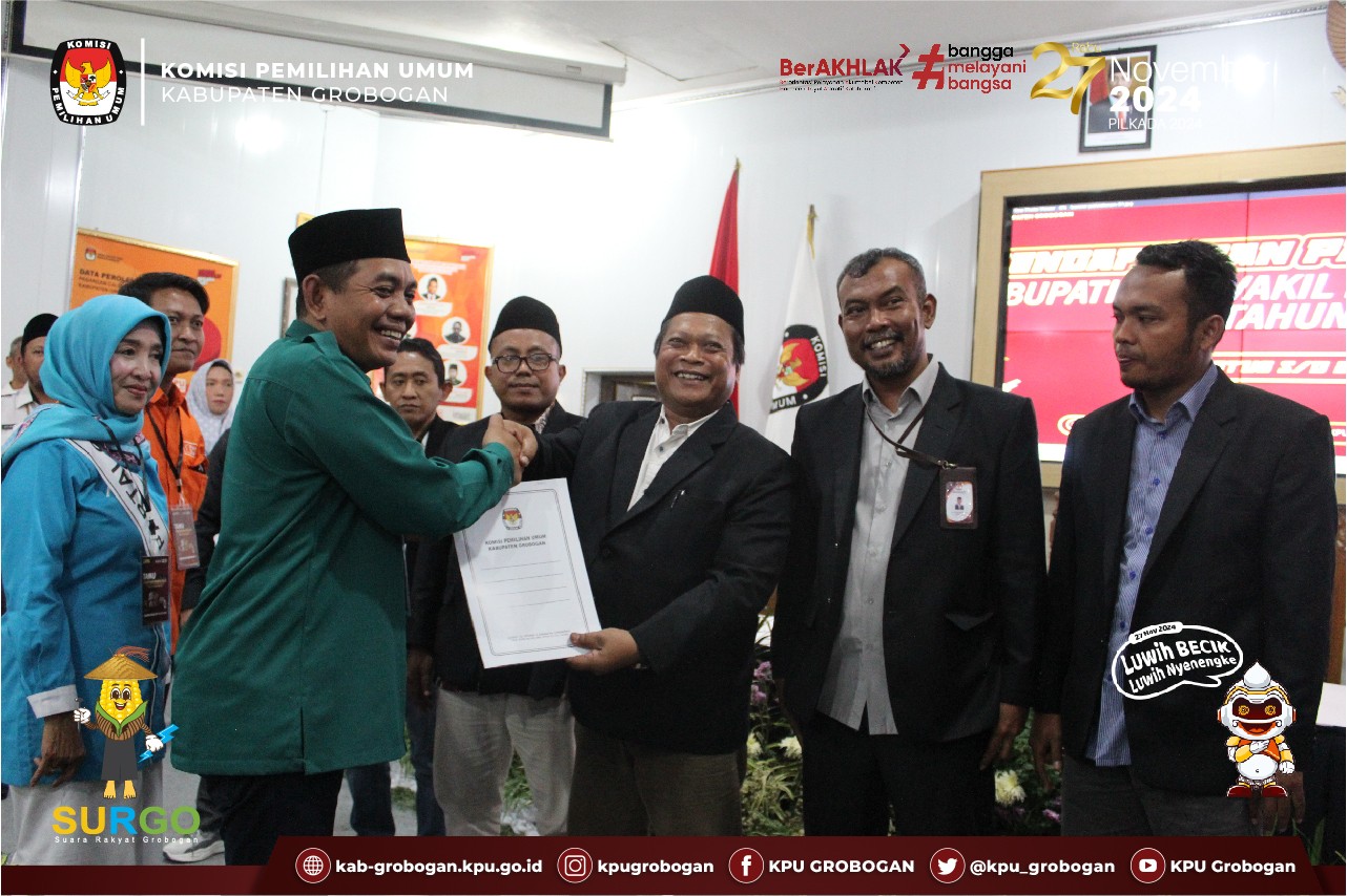 Setelah dilakukan verifikasi, memastikan kelengkapan dan kebenaran dokumen persyaratan pencalonan oleh KPU Kabupaten Grobogan, bahwa dokumen persyaratan pencalonan pendaftaran Bakal Pasangan Calon Bupati dan Wakil Bupati Grobogan Tahun 2024 atas nama dr. H. Bambang Pujiyanto, M.Kes. dan H. Catur Sugeng Susanto, S.H., M.H. dinyatakan diterima dengan status lengkap dan benar.