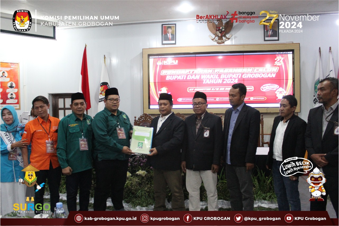 Hai #temanpemilih, di hari ke-3 Pendaftaran Bakal Pasangan Calon Bupati dan Wakil Bupati Grobogan Tahun 2024, KPU Kabupaten Grobogan menerima Pendaftaran Bakal Pasangan Calon Bupati dan Wakil Bupati Grobogan Tahun 2024 atas nama dr. H. Bambang Pujiyanto, M.Kes. dan H. Catur Sugeng Susanto, S.H., M.H., Kamis (29/8/2024), yang hadir beserta Ketua Partai Politik Pengusul yang terdiri dari Partai Kebangkitan Bangsa, Partai Buruh dan Partai Gelombang Rakyat Indonesia.