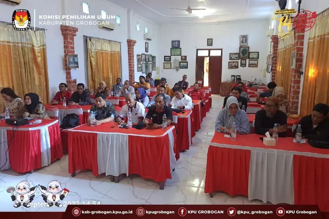 PURWODADI - Dalam rangka fasilitasi kepada Partai Politik Peserta Pemilu 2024, Jum'at 22 September 2023 bertempat di aula Sukarasa, KPU Kabupaten Grobogan gelar Rapat Koordinasi Persiapan Pencermatan Rancangan Daftar Calon Tetap (DCT) Anggota DPRD Kabupaten Grobogan dalam Pemilihan Umum Tahun 2024. Kegiatan dihadiri oleh Partai Politik Peserta Pemilu 2024 di Kabupaten Grobogan