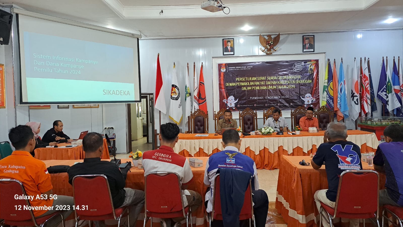 Serangkaian kegiatan diisi pengarahan dari Bapak Suwiknyo, S.Pd.I selaku Anggota KPU Kabupaten Grobogan Kadiv Teknis Penyelenggaraan. Beliau menyampaikan bahwa kegiatan ini merupakan persetujuan terakhir terkait surat suara calon anggota DPRD Kabupaten Grobogan dalam Pemilu Tahun 2024 untuk ditandatangani oleh Partai Politik Peserta Pemilu 2024, yang kemudian akan dibuatkan Berita Acara dan diajukan ke KPU RI melalui Biro Logistik secara terpusat. Selain itu, disampaikan pula dalam kegiatan ini prolog terkait dana kampanye yaitu mengenai Sistem Informasi Kampanye dan Dana Kampanye Pemilu 2024 (Sikadeka).