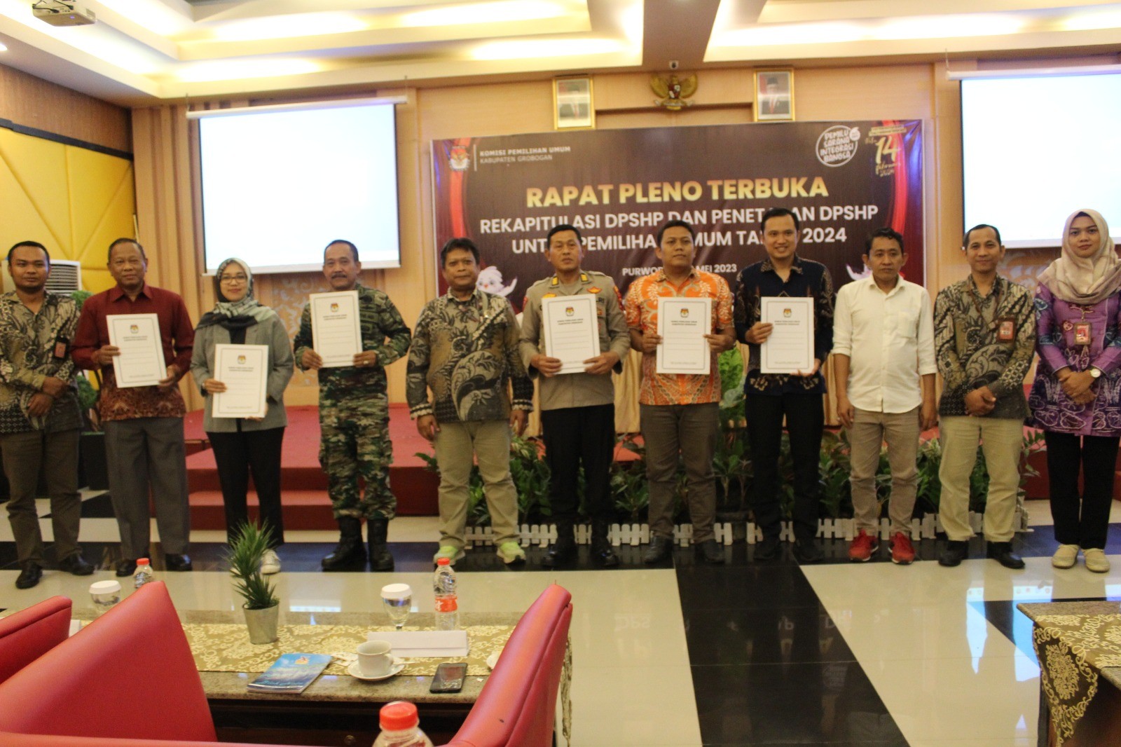 PURWODADI - Malam ini, 12 Mei 2023 tepat pukul 19.30 WIB KPU Kabupaten Grobogan menggelar Rapat Pleno Terbuka Rekapitulasi DPSHP Dan Penetapan DPSHP Untuk Pemilihan Umum Tahun 2024 di Hotel 21 Purwodadi, Jl. MT. Haryono No. 137 Purwodadi. Dihadiri oleh Dinas/Instansi terkait, Partai Politik di tingkat KabupatenGrobogan dan Ketua Serta Anggota PPK Koordinator Pemutakhiran Data se KabupatenGrobogan, acara ini berjalan khidmat.