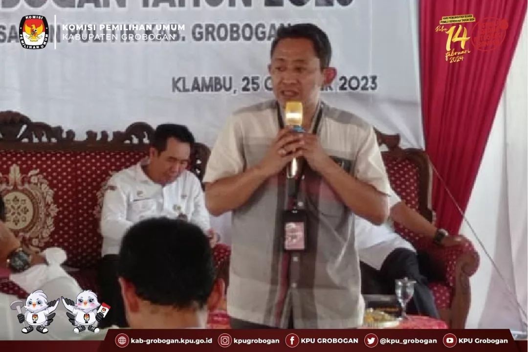 Rabu 25 Oktober 2023 bertempat di Balai Desa Penganten Kecamatan Klambu, KPU Kabupaten Grobogan menghadiri Sosialisasi Pemilihan Umum Kepada Masyarakat Kabupaten Grobogan Tahun 2023 yang sekaligus menjadi narasumber dalam kegiatan tersebut.