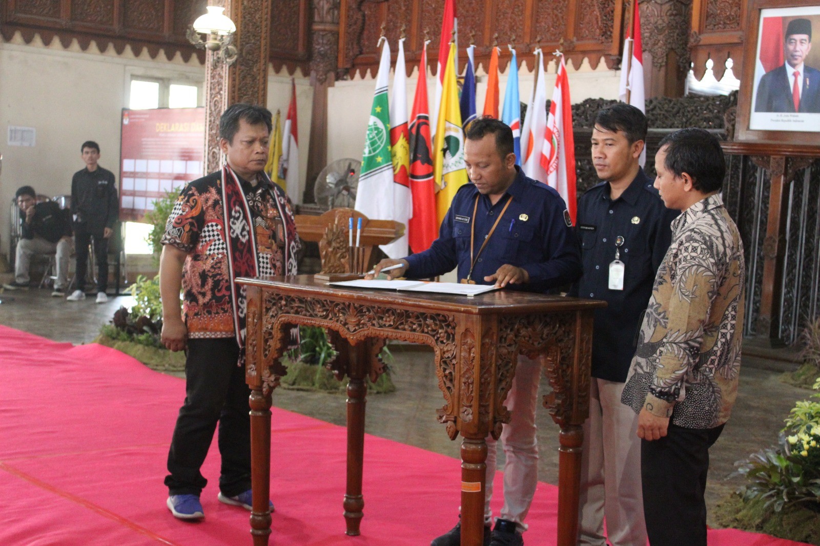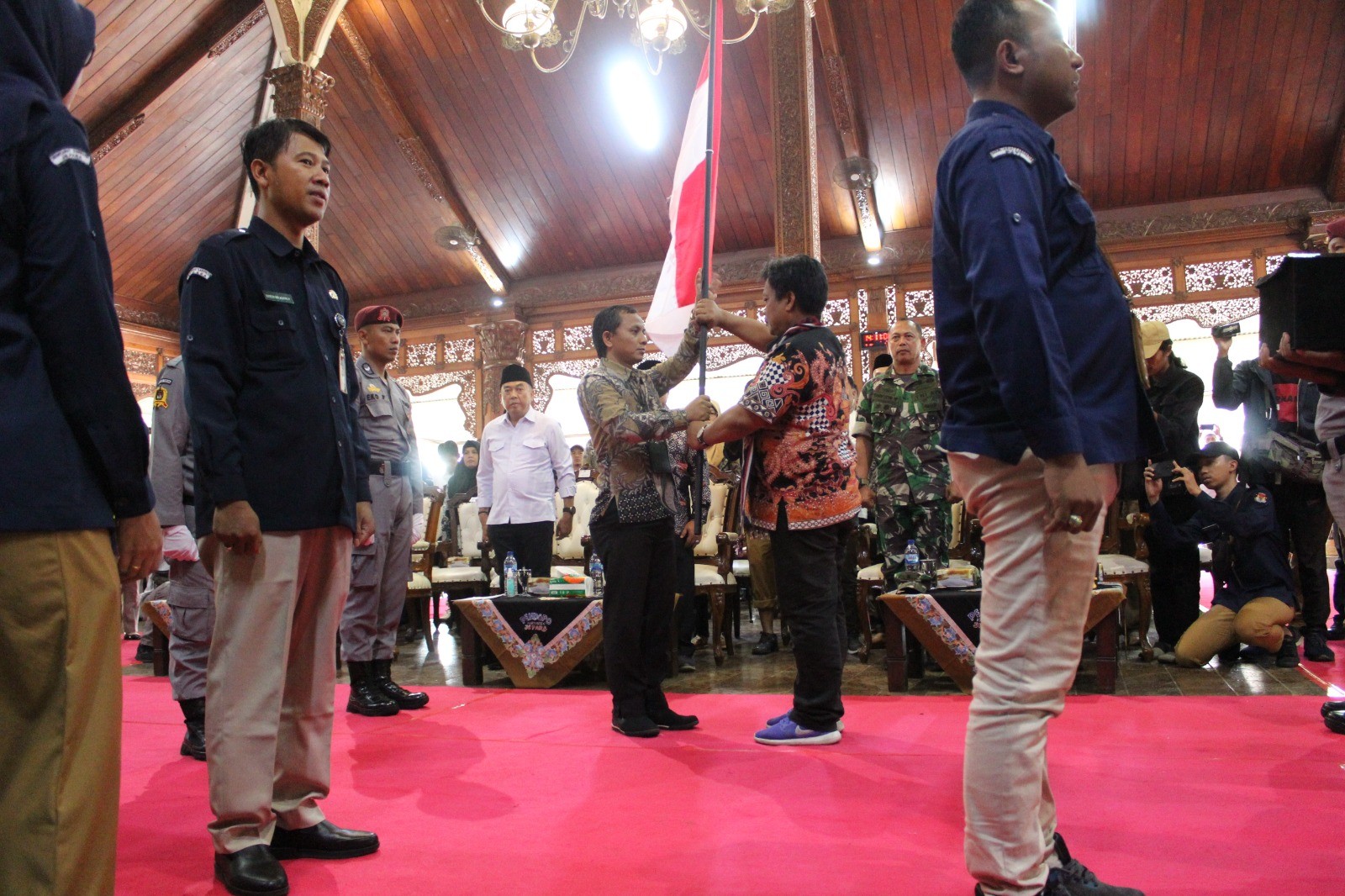 JEPARA - Sabtu, 7 Oktober 2023 bertempat di Pendopo Kabupaten Jepara, KPU Kabupaten Grobogan melaksanakan serah terima Kirab Pemilu 2024 kepada KPU Kabupaten Jepara, sekaligus penandatanganan Berita Acara Serah Terima Bendera Kirab Pemilu Tahun 2024. Bendera Kirab Pemilu Tahun 2024 diserahkan oleh Agung Sutopo selaku Ketua KPU Kabupaten Grobogan kepada Ketua KPU Kabupaten Jepara Bapak Subhan Zuhri, S. Pd. I. Sedangkan Berita Acara Serah Terima Bendera Kirab Pemilu Tahun 2024 ditandatangani oleh Sekretaris KPU Kabupaten Grobogan Bapak Qurniawan Adi Utomo, SH dan Sekretaris KPU Kabupaten Jepara Bapak Yuyun Sri Agung Purnomo, S. STP, M. Si.