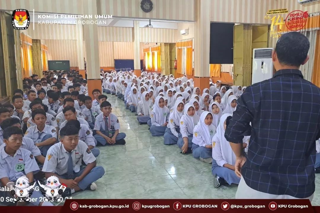 GUBUG - Rabu 20 September 2023 bertempat di SMA Negeri 1 Gubug, KPU Kabupaten Grobogan menghadiri kegiatan P5 Suara Demokrasi bertajuk Pemilih Pemula dan No Golput. Dalam kesempatan kali ini hadir sebagai Narasumber Anggota KPU Kabupaten Grobogan Kadiv Perencanaan, Data dan Informasi Bapak M. Machruz, ST. Adapun dengan diadakannya kegiatan ini, harapannya dapat meningkatkan wawasan serta pengetahuan siswa tentang demokrasi dan kepemiluan, yang kemudian dapat diaplikasikan di kehidupan sehari-hari salah satunya yaitu ikut berpartisipasi menentukan pilihannya dalam Pemilu 2024 nantinya.