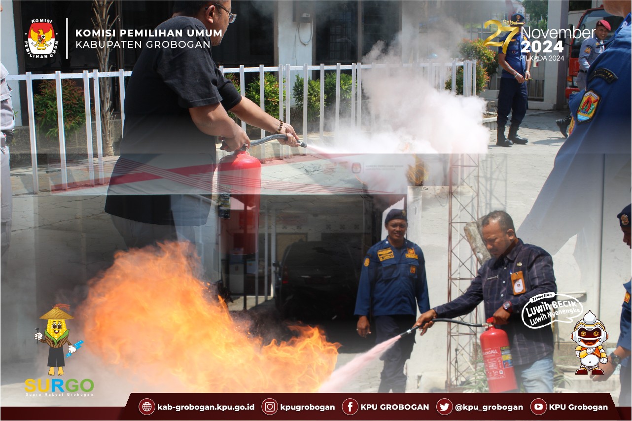 Hai #temanpemilih , KPU Kabupaten Grobogan melaksanakan Latihan dan Simulasi Pemadaman Kebakaran KPU Kabupaten Grobogan Tahun 2024, Kamis (25/7/2024). Kegiatan yang bertempat di Kantor KPU Kabupaten Grobogan ini diikuti Anggota beserta jajaran Sekretariat KPU Kabupaten Grobogan dan dibimbing langsung oleh Satpol PP dan Damkar Kabupaten Grobogan Bidang Pemadam Kebakaran.