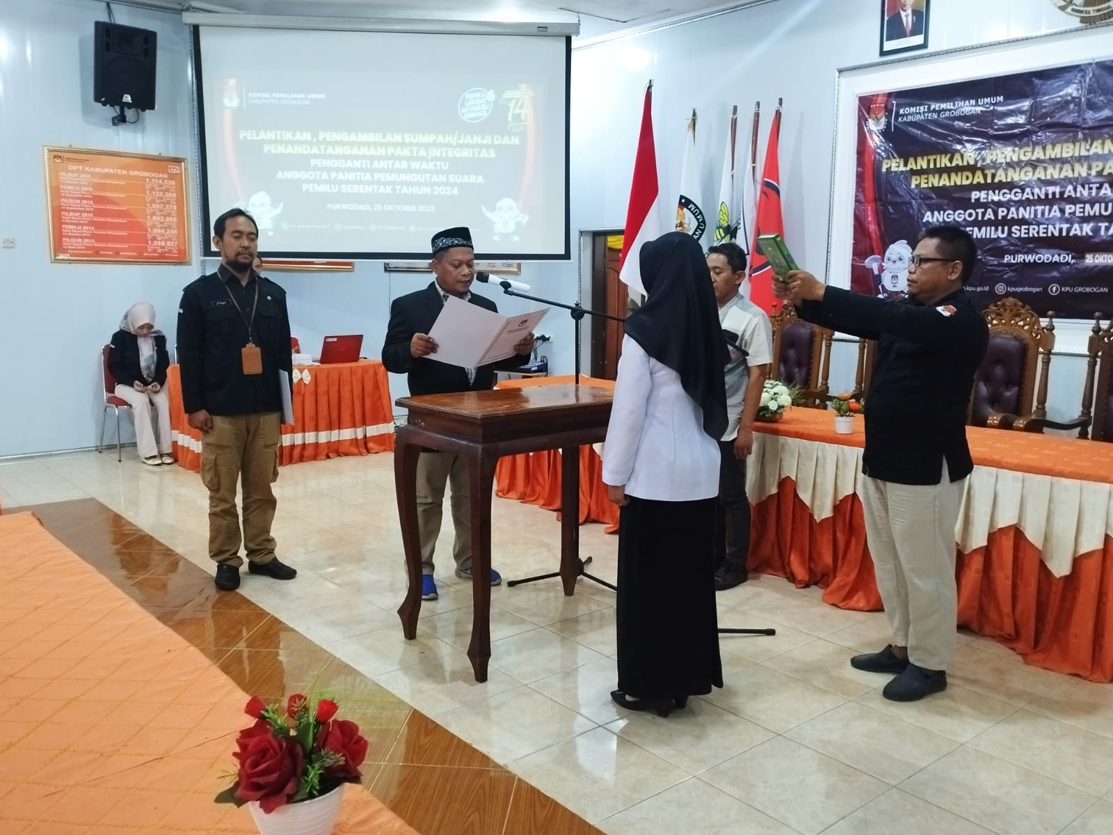 PURWODADI - Rabu, 25 Oktober 2023, bertempat di Aula, KPU Kabupaten Grobogan menggelar Pelantikan sekaligus pengambilan sumpah/janji serta penandatanganan pakta integritas Pengganti Antar Waktu Anggota Panitia Pemungutan Suara (PPS) Kelurahan Kuripan Kecamatan Purwodadi dalam Pemilu Tahun 2024. Dimana Sdri. Okta Friantina Rahardianing Tyas menggantikan Sdr. Verry Nurhasri Sahli yang telah mengundurkan diri.