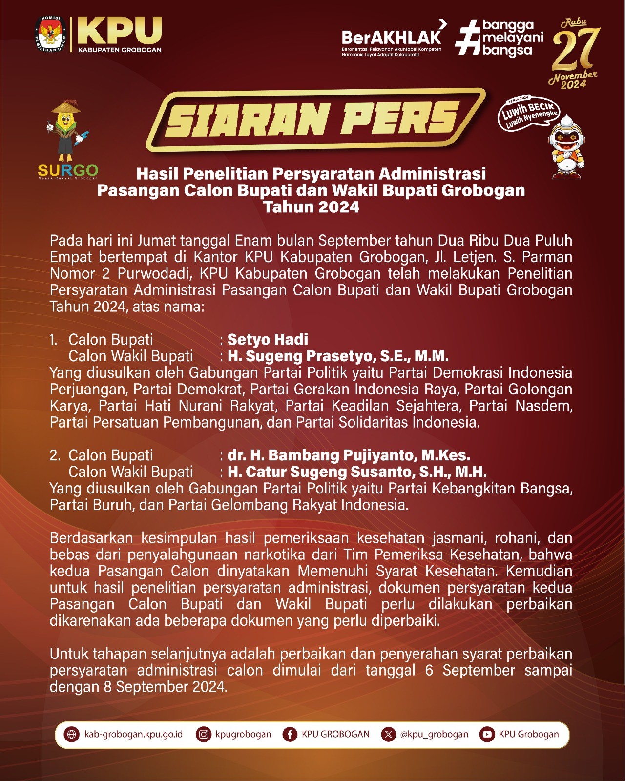 Disampaikan bahwa dari hasil pemeriksaan kesehatan jasmani, rohani dan bebas dari penyalahgunaan narkotika yang telah dilaksanakan pada Jum'at s/d Sabtu, 30 s/d 31 Agustus 2024 di RSUP Dr. Kariadi Semarang, bahwa kedua Pasangan Calon, Setyo Hadi - H. Sugeng Prasetyo, S.E., M.M. dan dr. H. Bambang Pujiyanto, M.Kes. - H. Catur Sugeng Susanto, S.H., M.H. dinyatakan Memenuhi Syarat Kesehatan untuk mengikuti tahapan Pemilihan Bupati dan Wakil Bupati Grobogan Tahun 2024.