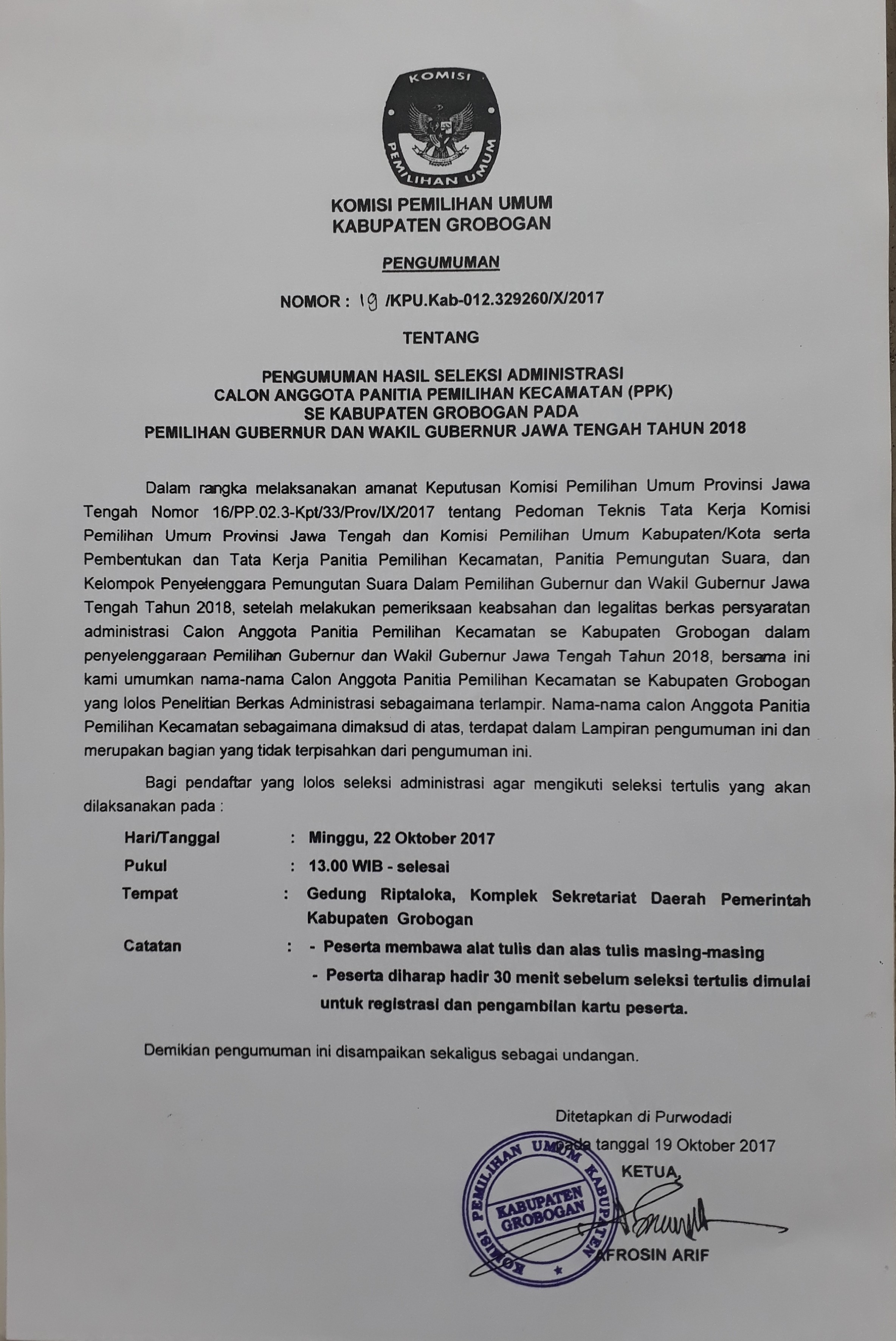 Berikut diumumkan hasil seleksi administrasi calon anggota PPK pada Pilgub Jateng 2018.