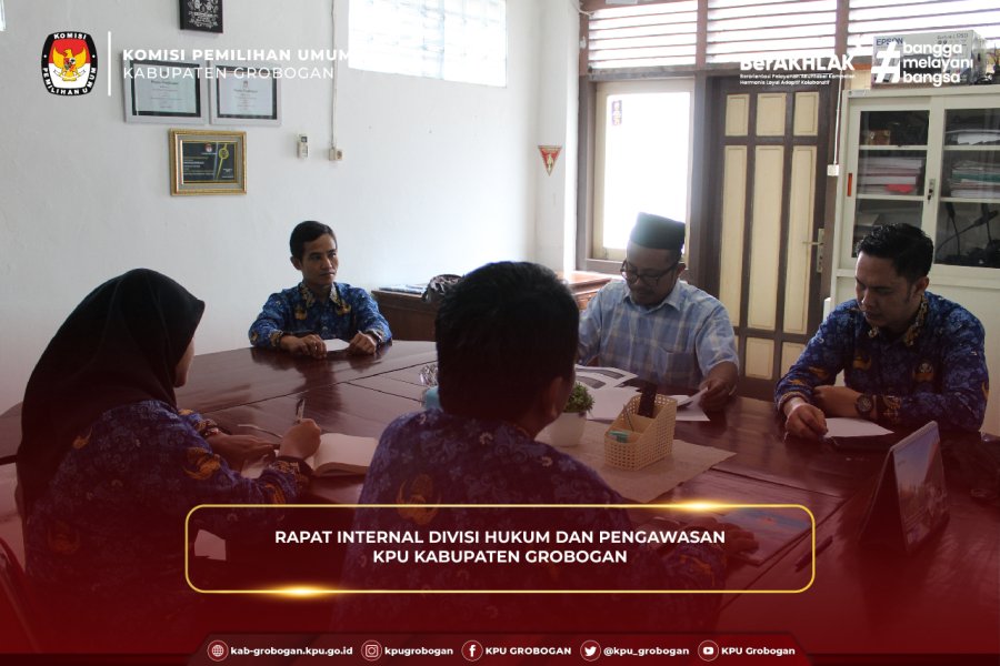 Rapat dipimpin oleh Anggota KPU Kabupaten Grobogan Divisi Hukum dan Pengawasan, Muh Syaifudin, S.Pd.I., M.Pd. dan diikuti oleh Kasubbag Teknis Penyelenggaraan Pemilu dan Hukum, Heri Prasetiyo, S.Sos. beserta staf.