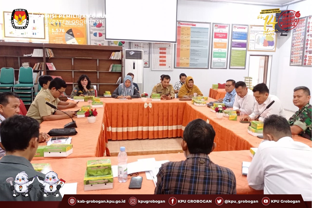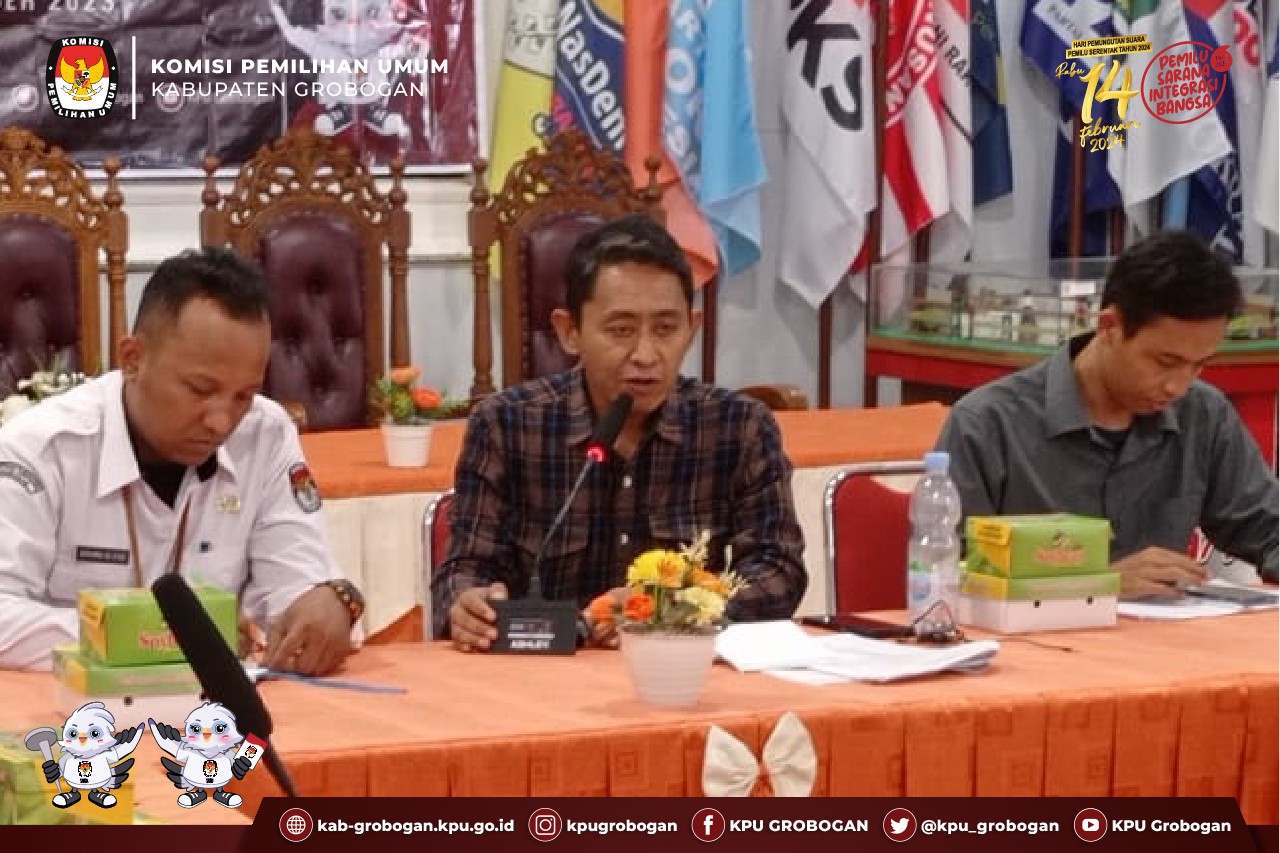 Rapat dibuka oleh Anggota KPU Kabupaten Grobogan Kadiv Sosdiklih Parmas dan SDM Bapak Ngatiman, SE selaku leading sector dalam tahapan ini yang sekaligus penyampaian materi terkait Kebijakan Kampanye dalam Pemilihan Umum Serentak Tahun 2024. Beliau menyampaikan melalui kegiatan ini mengajak kepada para tamu undangan untuk berkontribusi dalam rangka sukses penyelenggaraan Pemilu 2024 terkait lokasi pemasangan Alat Peraga Kampanye, yang hal ini tertuang dalam pasal 36 ayat 4 Peraturan Komisi Pemilihan Umum Nomor 20 Tahun 2023 tentang Perubahan atas Peraturan Komisi Pemilihan Umum Nomor 15 Tahun 2023 tentang Kampanye Pemilihan Umum, dimana lokasi pemasangan Alat Peraga Kampanye ditetapkan setelah berkoordinasi dengan pemerintahan daerah. Ini juga didasarkan atas Surat dari KPU RI dan Surat dari KPU Provinsi Jawa Tengah perihal pemberitahuan agar KPU Kabupaten/Kota menetapkan lokasi pemasangan Alat Peraga Kampanye Pemilu dengan keputusan KPU Kabupaten/Kota setelah berkoordinasi dengan pemerintah daerah.