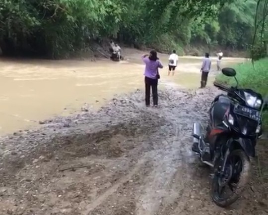 Warga yang terbiasa akan mudah melewati sungai ini dengan menggunakan sepeda motor.