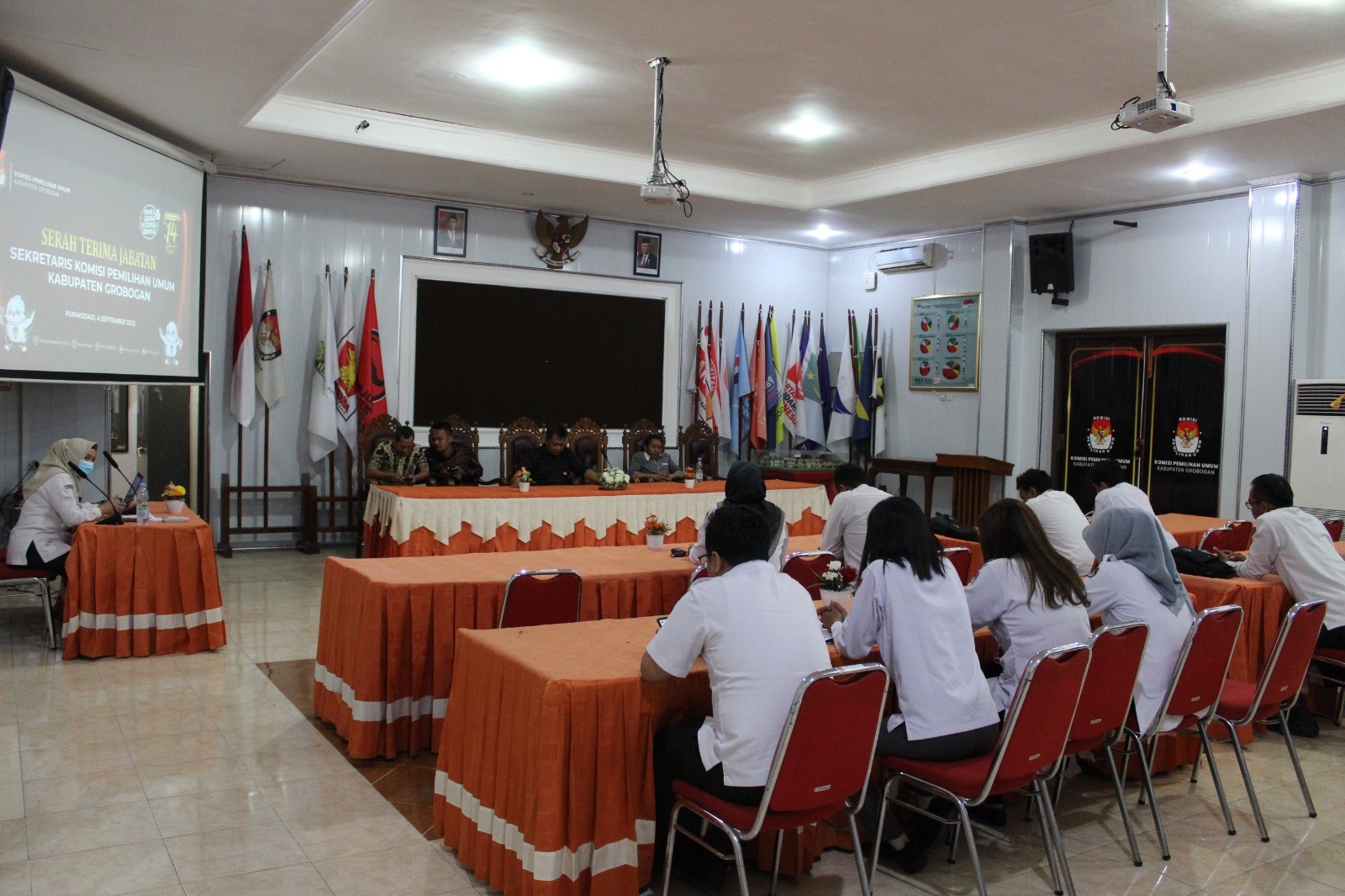 PURWODADI - Hari ini, pukul 10.00 WIB bertempat di aula KPU Kabupaten Grobogan Jl. Letjend. S. Parman No. 2 Purwodadi, KPU Kabupaten Grobogan melaksanakan kegiatan Serah Terima Jabatan Sekretaris Komisi Pemilihan Umum Kabupaten Grobogan. Pada kesempatan tersebut juga dilakukan penandatanganan Berita Acara Serah Terima Jabatan, dimana dalam kegiatan ini Bapak Qurniawan Adi Utomo, S.H. menggantikan Ibu Yudhaviska Adhidhara Silviawardhanie, S.E., M.H. yang kini menjabat sebagai Fungsional Ahli Madya Tata Kelola Pemilu pada Sekretariat Komisi Pemilihan Umum Provinsi Jawa Tengah.