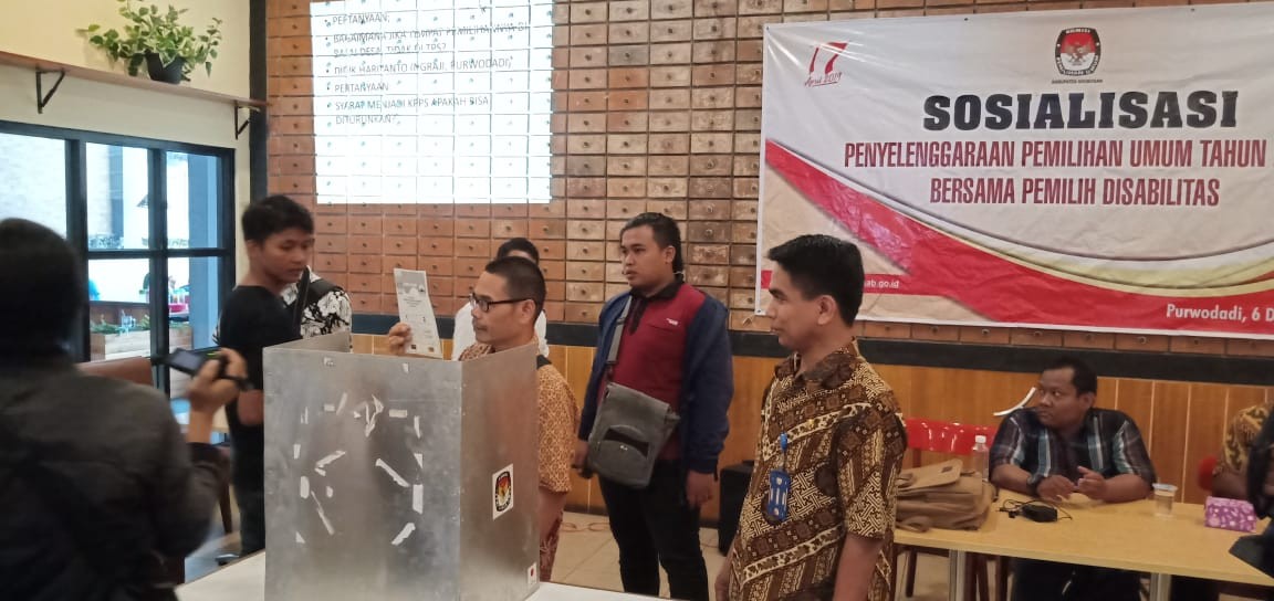 Bertempat di Aula RM. Noroyono, KPU Kab. Grobogan menggelar Sosialisasi Penyelenggaraan Pemilu 2019 bersama Pemilih Penyandang Disabilitas, pada Kamis, 6 Desember 2018. Sosialisasi kali ini bertujuan untuk meningkatkan hak pilih di kalangan pemilih penyandang disabilitas, juga untuk memberikan informasi kepemiluan yang berkaitan dengan segmen pemilih penyandang disabilitas.
