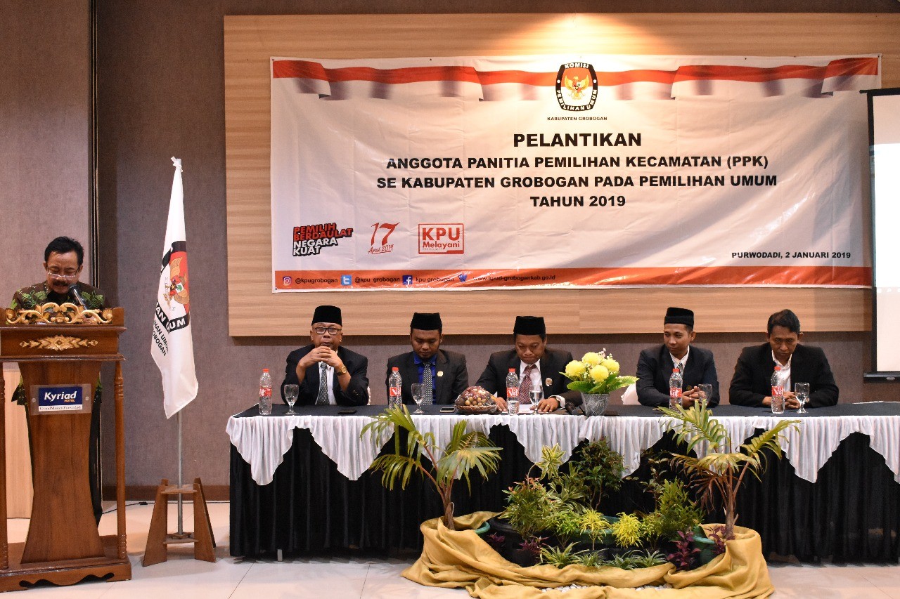 Sesuai dengan Surat Ketua KPU RI Nomor 1509/PP.05-SD/01/KPU/XII/2018 tanggal 14 Desember 2018 tentang Penetapan Dan Pengangkatan Anggota PPK Dan PPS Pemilu Tahun 2019, KPU Kab. Grobogan melantik anggota Panitia Pemilihan Kecamatan (PPK) untuk Pemilu 2019 di Hotel Grand Master Purwodadi tanggal 2 Januari 2019 pukul 10.00 WIB. Acara pelantikan ini dihadiri oleh Sekda Kabupaten Grobogan yang mewakili Bupati Grobogan yang berhalangan hadir. Selain Sekda Kabupaten Grobogan, hadir pula seluruh jajaran FKPD Grobogan, Ketua dan Anggota Bawaslu Kab. Grobogan, Ketua Partai Politik peserta Pemilu 2019 di Grobogan, juga Ketua PPK Pemilu 2019 pada acara ini. Pelantikan tersebut berjalan lancar dari dimulainya pengucapan sumpah/janji oleh seluruh anggota PPK, penandatanganan berita acara sumpah/janji hingga pemberian ucapan selamat oleh seluruh tamu undangan. Baik Ketua KPU Kab. Gobogan ataupun Bupati Grobogan mengapresiasi kegiatan ini, dalam sambutannya berharap agar anggota PPK Pemilu Tahun 2019 ini bisa menjalankan tugasnya dengan baik, dan penuh tanggungjawab, sehingga iklim kondusif selama penyelenggaraan Pemilu 2019 dapat tercipta dan Pemilu 2019 bisa berjalan dengan aman.