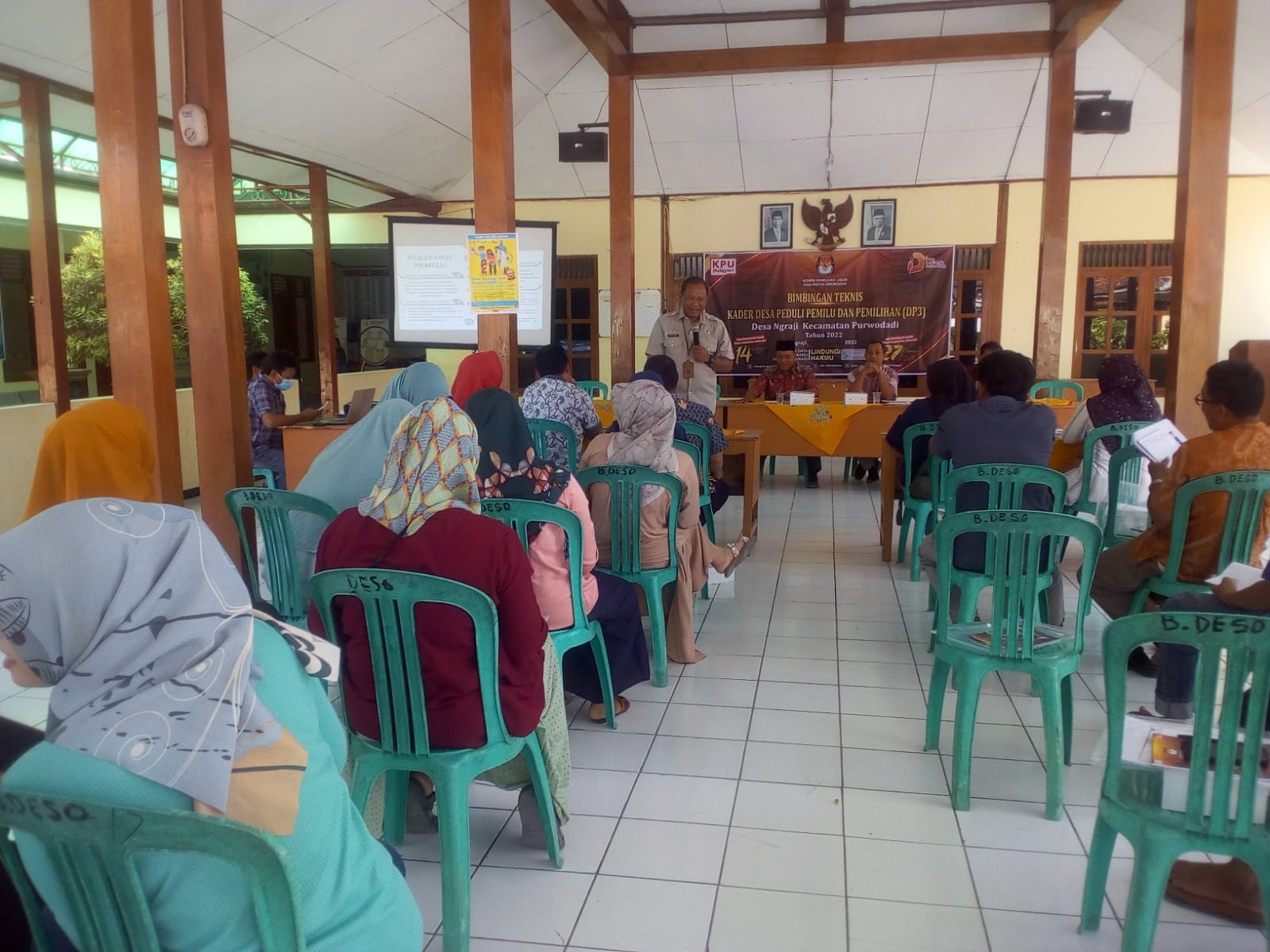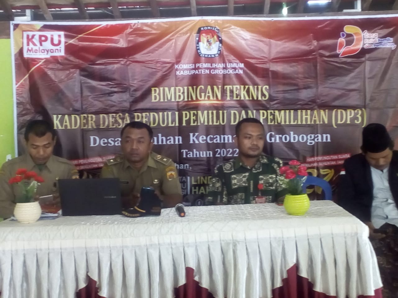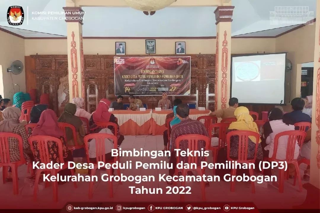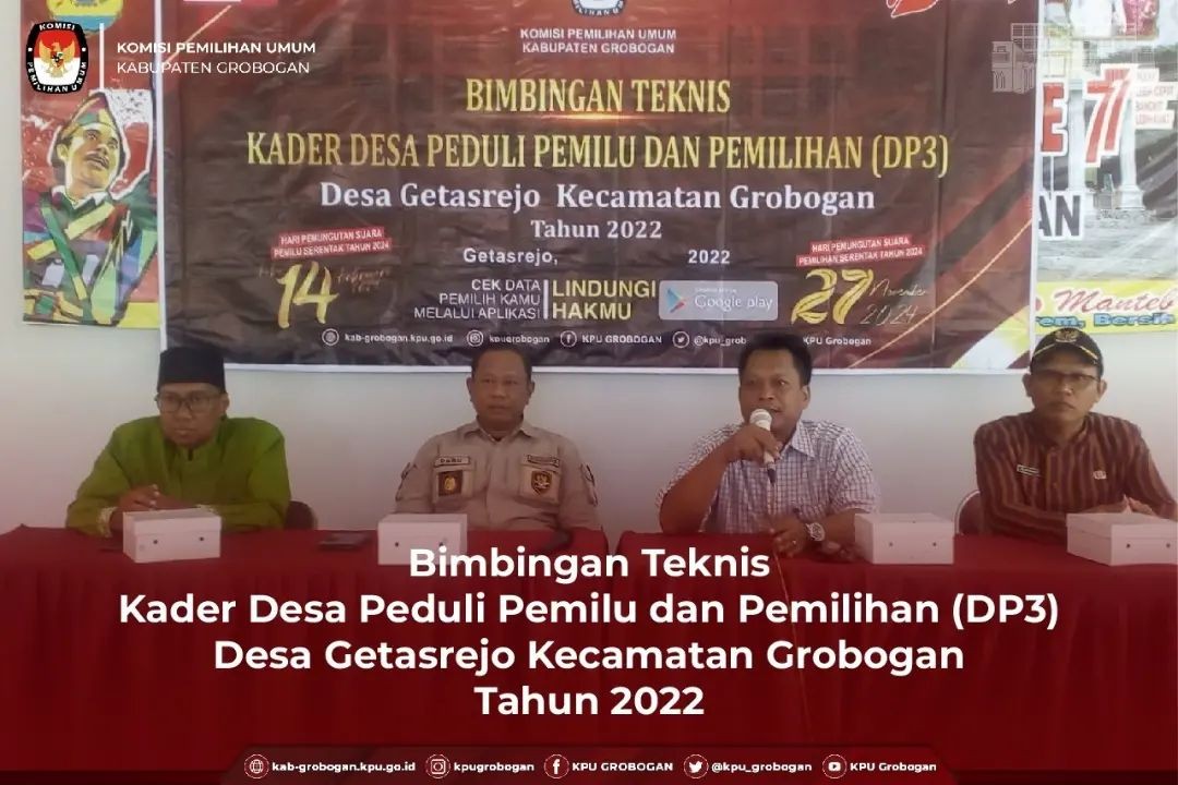GROBOGAN - Rabu, 31 Agustus 2022, Dalam rangka meningkatkan kualitas dan kuantitas partisipasi pemilih untuk sukses penyelenggaraan Pemilu dan Pemilihan 2024 serta membangun kesadaran politik masyarakat agar menjadi pemilih yang berdaulat, Komisi Pemilihan Umum Kabupaten Grobogan menyelenggarakan Bimbingan Teknis (Bimtek) untuk Kader Desa Peduli Pemilu dan Pemilihan (DP3) di Desa Sedayu Kecamatan Grobogan. Hadir dalam Bimtek ini 25 kader Desa Peduli Pemilu dan Pemilihan (DP3) dari masing-masing basis. Pemateri pertama adalah Anggota Komisi Pemilihan Umum Kabupaten Grobogan Divisi Sosialisasi, Pendidikan Pemilih, Partisipasi Masyarakat dan SDM, Ngatiman, SE dengan materi Desa Peduli Pemilu dan Pemilihan (DP3) serta Sistem dan Tahapan Pemilu dan Pemilihan. Kemudian dilanjutkan oleh pemateri kedua yaitu dari Bakesbangpol Kabupaten Grobogan Bambang Susilo dengan materi yaitu Pendidikan Politik Dalam Pencegahan Politik Uang. Materi terakhir disampaikan oleh Ketua PWI Kabupaten Grobogan Felek Wahyu Prabowo yaitu Teknik dan Identifikasi Berita Bohong (Hoaks). Karena materi-materi yang disampaikan oleh narasumber menarik bagi Kader DP3, maka suasanapun menjadi lebih hangat. Dengan penyampaian yang sederhana, membuat Kader DP3 Desa Sedayu Kecamatan Grobogan tertarik untuk menyimak materi yang disampaikan oleh narasumber. Banyak pertanyaan yang dilontarkan oleh kader DP3 Desa Sedayu Kecamatan Grobogan, antara lain bagaimana cara menghindari politik uang. Pertanyaan-pertanyaan ini dijawab dengan apik oleh narasumber. Ngatiman berharap dengan Bimtek Kader DP3 Desa Sedayu Kecamatan Grobogan dapat meningkatkan partisipasi pemilih di Desa Sedayu khususnya, dan masyarakat Grobogan pada umumnya. Sementara Bambang berharap Bimtek Kader DP3 Desa Sedayu Kecamatan Grobogan ini mampu meminimalisir terjadinya praktek politik uang. By : MM