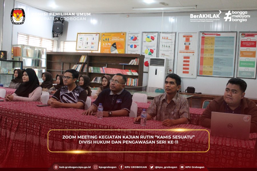 Hai #TemanPemilih, KPU Kabupaten Grobogan mengikuti zoom meeting Kegiatan Kajian Rutin “Kamis Sesuatu” Divisi Hukum dan Pengawasan Seri ke-11 bertempat di Aula Kantor KPU Kabupaten Grobogan, Jum'at (25/7/2025). Kegiatan yang diselenggarakan oleh KPU Provinsi Jawa Tengah ini diikuti oleh Kadiv Hukum dan Pengawasan KPU Kabupaten Grobogan, Muh Syaifudin, S.Pd.I., M.Pd. dan Heri Prasetiyo, S.Sos., Kasubbag Teknis Penyelenggaraan Pemilu dan Hukum Sekretariat KPU Kabupaten Grobogan beserta Staf. Adapun episode kali ini mengusung tema Putusan MK PHPU Pemilihan Bupati dan Wakil Bupati Kabupaten Tasikmalaya Tahun 2024, dengan menghadirkan narasumber Ade Abdullah Sidiq, Kadiv Hukum dan Pengawasan KPU Kabupaten Tasikmalaya dan Kadiv Hukum dan Pengawasan KPU Kota Salatiga, Nurwachid Efendi. Kegiatan dibuka oleh Ketua KPU Provinsi Jawa Tengah dalam hal ini diwakili oleh Kadiv SDM, Penelitian dan Pengembangan KPU Provinsi Jawa Tengah, Mey Nurlela. Apresiasi disampaikan untuk kegiatan Kamis Sesuatu yang telah memasuki Seri Ke-11. Disampaikan bahwa kasus yang ada di Kabupaten Tasikmalaya hampir menyerupai dengan yang ada di Kabupaten Purbalingga terkait dengan periodesasi yaitu incumbent yang telah menjabat 2 kali periode. Bedanya incumbent yang ada di Kabupaten Purbalingga tidak menang sehingga tidak ada gugatan atas hal tersebut. Mey Nurlela berharap kegiatan ini dapat menjadi pembelajaran bersama dan analisis terhadap situasi ini bisa memberikan pencerahan untuk kita semua. Memasuki inti acara penyampaian pengantar oleh Kadiv Hukum dan Pengawasan KPU Provinsi Jawa Barat Aneu Nursifah yang kemudian dilanjutkan pembahasan materi oleh masing-masing narasumber. Kegiatan ditutup dengan arahan dan kajian hukum oleh Muslim Aisha, Kadiv Hukum dan Pengawasan KPU Provinsi Jawa Tengah.