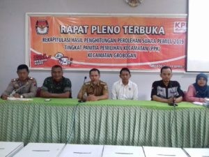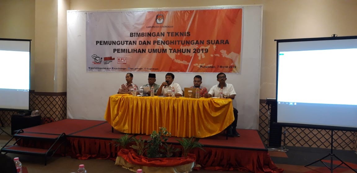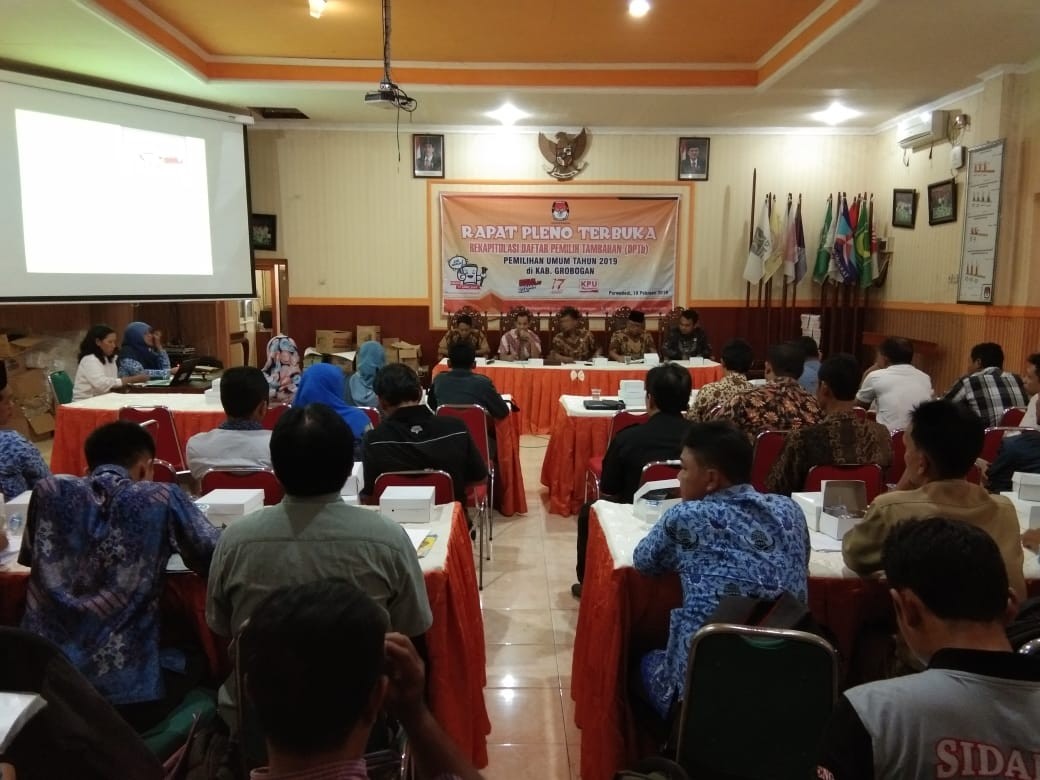 Hari ini, bertempat di Aula KPU Kab. Grobogan Jl. S. Parman No.2 Purwodadi, KPU Kab. Grobogan gelar Rapat Pleno Terbuka Penetapan Daftar pemilih Tambahan (DPTb) Tingkat Kabupaten/Kota dalam Pemilihan Umum Tahun 2019. Pada rapat pleno kali ini Muhammad Machruz, ST selaku Anggota KPU Kab. Grobogan divisi perencanaan, data dan informasi menyampaikan beberapa point penting sekitar penyusunan DPTb, seperti alasan pembuatan A5 sebagai dasar penyusunan DPTb, dasar hukum penyusunan DPTb, serta proses input DPTb yang melibatkan seluruh PPK dan PPS se kabupaten Grobogan.