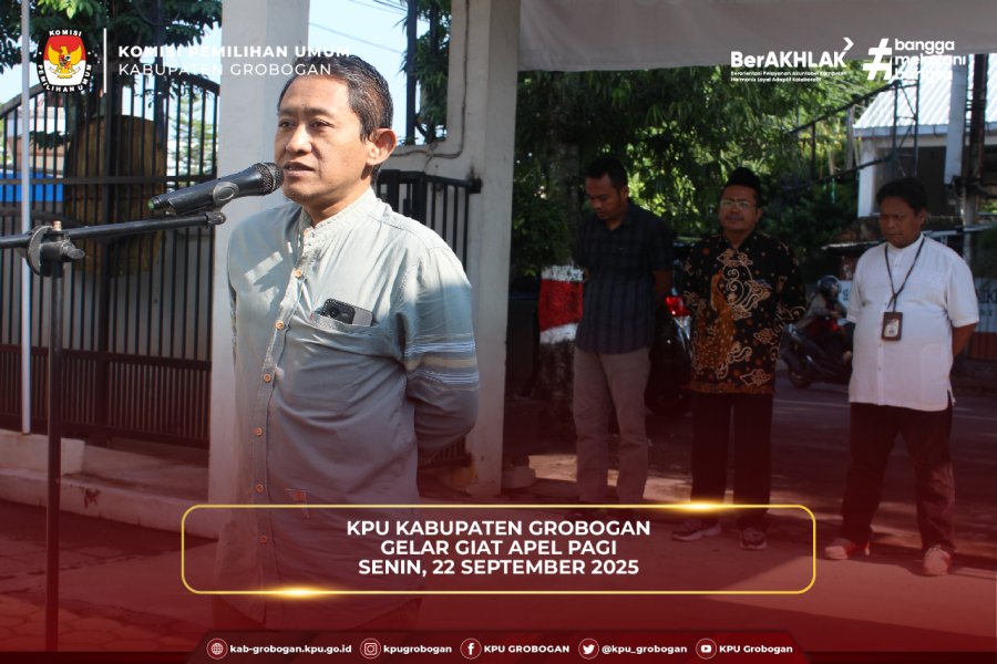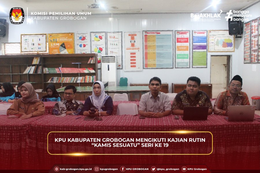 Hai #TemanPemilih, bertempat di aula, KPU Kabupaten Grobogan mengikuti Kajian Rutin “Kamis Sesuatu” Seri ke-19 yang digelar oleh KPU Provinsi Jawa Tengah, Kamis (18/9/2025). Acara yang berlangsung secara daring ini diikuti seluruh KPU Kabupaten/Kota se-Jawa Tengah. Hadir sebagai narasumber antara lain M. Agus Muslim (Kadiv Hukum dan Pengawasan KPU Provinsi Banten), Dede Abdurrosyid (Kadiv Hukum dan Pengawasan KPU Kabupaten Serang), serta Iman Santosa (Kadiv Hukum dan Pengawasan KPU Kota Pekalongan).