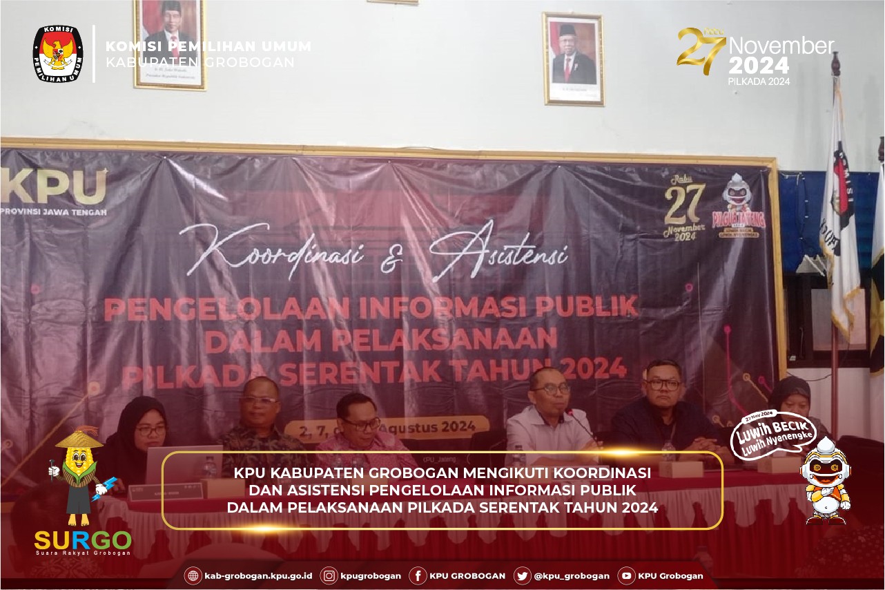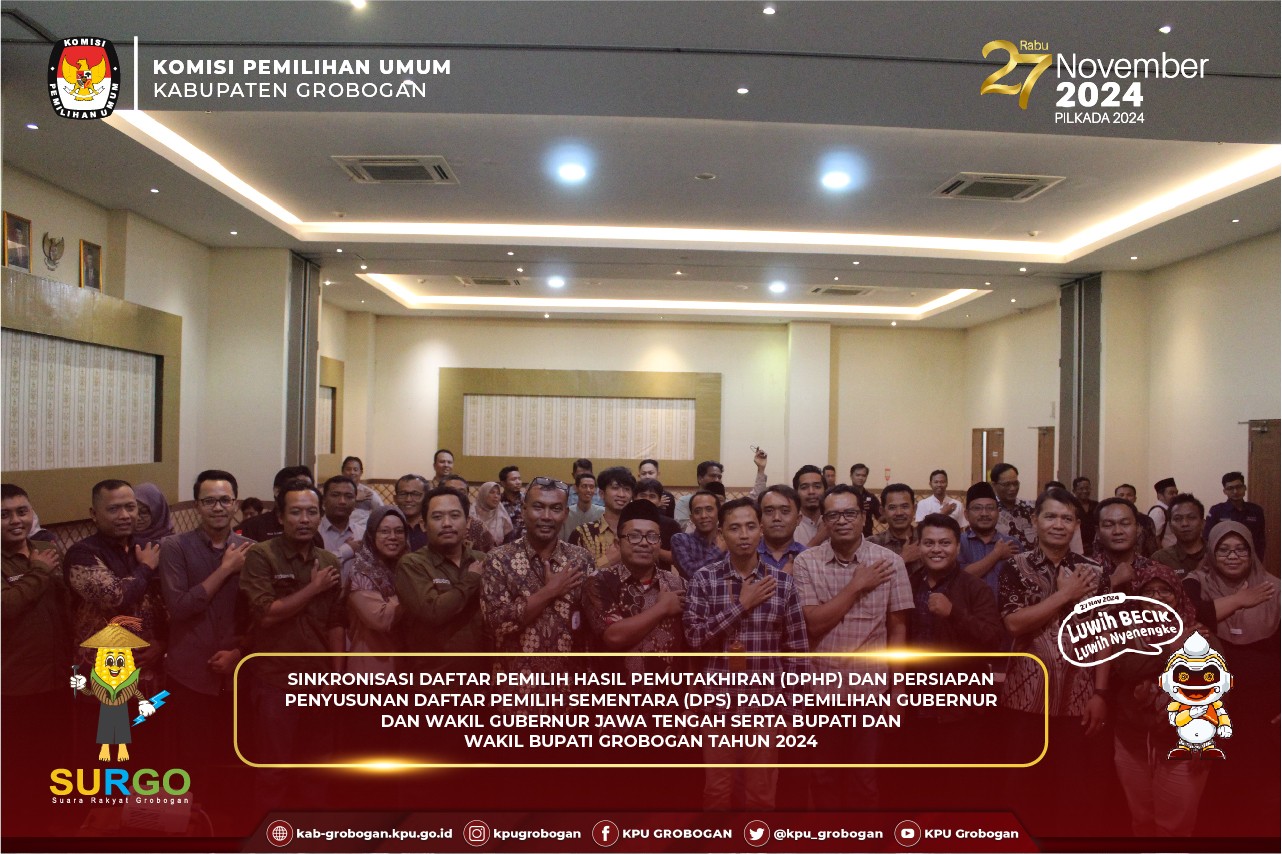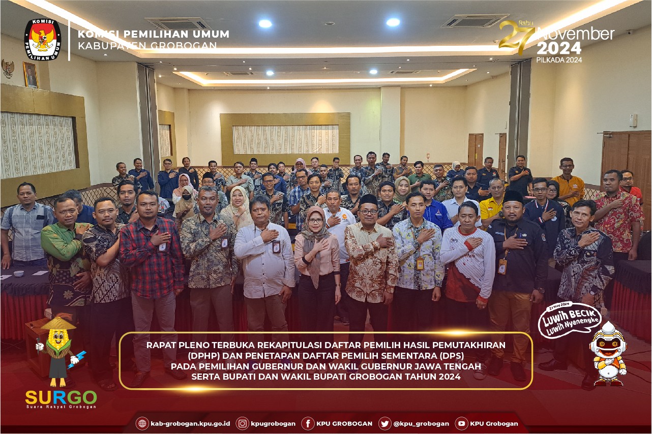 Hai #temanpemilih, KPU Kabupaten Grobogan menyelenggarakan Rapat Pleno Terbuka Rekapitulasi Daftar Pemilih Hasil Pemutakhiran (DPHP) dan Penetapan Daftar Pemilih Sementara (DPS) pada Pemilihan Gubernur dan Wakil Gubernur Jawa Tengah serta Bupati dan Wakil Bupati Grobogan Tahun 2024, Minggu (11/8/2024). Acara yang bertempat di Hotel Front One Purwodadi ini diikuti dari unsur TNI/Polri, OPD terkait, Bawaslu Kabupaten Grobogan, Partai Politik yang memperoleh kursi DPRD Kabupaten, Perwakilan Pemantau Pemilihan dan Ketua Panitia Pemilihan Kecamatan (PPK) beserta Anggota Panitia Pemilihan Kecamatan (PPK) Koordinator Pemutakhiran Data se-Kabupaten Grobogan. Hadir juga dalam kegiatan ini Anggota KPU Provinsi Jawa Tengah, Ibu Mey Nurlela, S.S., M.Si. Acara dibuka oleh Ketua KPU Kabupaten Grobogan, Bapak Agung Sutopo, S.Pi. Dalam sambutannya disampaikan bahwa dari hasil rekapitulasi DPHP ini nantinya akan ditetapkan menjadi DPS. Di tengah daftar pemilih yang pegerakannya dinamis, Beliau berharap nantinya diperoleh daftar pemilih yang valid serta mutakhir. Selanjutnya pembacaan tata tertib pelaksanaan Rapat Pleno Terbuka Rekapitulasi Daftar Pemilih Hasil Pemutakhiran (DPHP) dan Penetapan Daftar Pemilih Sementara (DPS) pada Pemilihan Gubernur dan Wakil Gubernur Jawa Tengah serta Bupati dan Wakil Bupati Grobogan Tahun 2024 oleh Anggota KPU Kabupaten Grobogan Divisi Hukum dan Pengawasan, Bapak Muh Syaifudin, S.Pd.I, M.Pd. Memasuki inti acara adalah Pembacaan Rekapitulasi DPHP dan Penetapan DPS pada Pemilihan Gubernur dan Wakil Gubernur Jawa Tengah serta Bupati dan Wakil Bupati Grobogan Tahun 2024 oleh masing-masing PPK yang dipimpin langsung oleh Bapak Agung Budi Prasetyo, A.Md. Anggota KPU Kabupaten Grobogan Divisi Perencanaan, Data dan Informasi. Dari hasil rapat pleno terbuka bahwa Kabupaten Grobogan yang terdiri dari 19 Kecamatan, 280 Desa/Kelurahan dan 2.142 TPS, telah ditetapkan rekapitulasi DPS yaitu sejumlah 1.133.494 pemilih yang terdiri dari laki-laki sejumlah 564.911 pemilih dan perempuan sejumlah 568.583 pemilih.