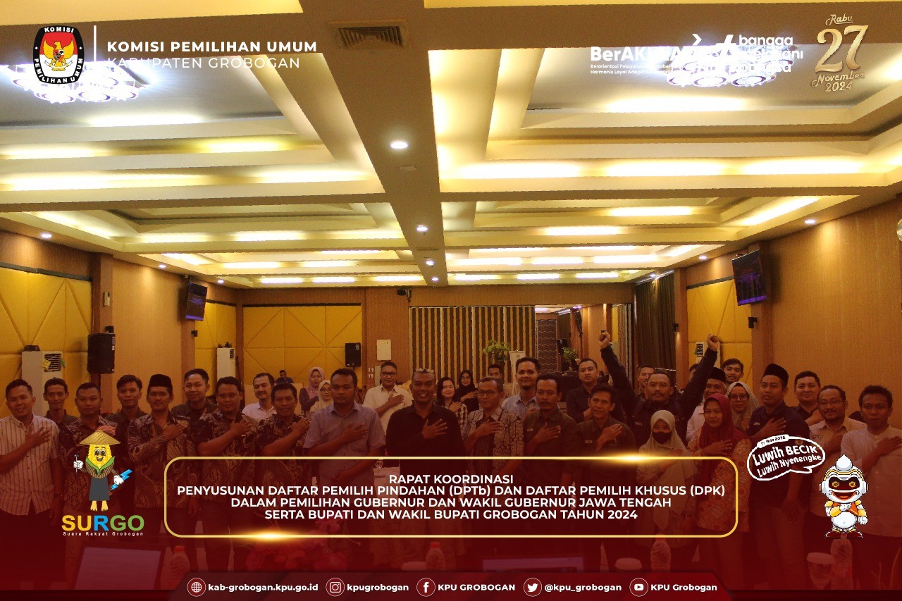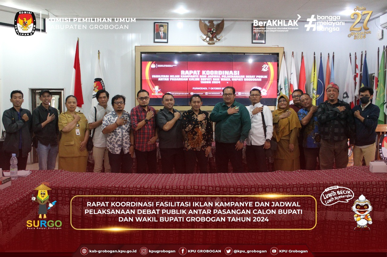 Hai #temanpemilih, KPU Kabupaten Grobogan gelar Rapat Koordinasi Fasilitasi Iklan Kampanye dan Jadwal Pelaksanaan Debat Publik Antar Pasangan Calon Bupati dan Wakil Bupati Grobogan Tahun 2024, Senin (7/10/2024).