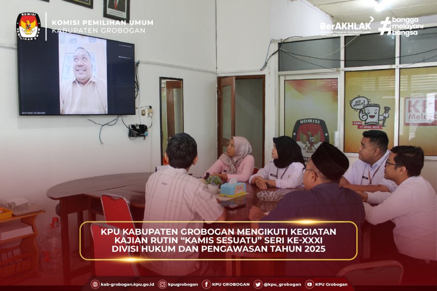 Hai #TemanPemilih, KPU Kabupaten Grobogan mengikuti kegiatan Kajian Rutin “Kamis Sesuatu” Seri ke-XXXI Divisi Hukum dan Pengawasan Tahun 2025 di Lantai 2 Kantor KPU Grobogan, Kamis (11/12/2025). Kegiatan yang diselenggarakan oleh KPU Provinsi Jawa Tengah ini mengangkat tema “Putusan Perkara Nomor 260/PHPU.BUP-XXIII/2025 Bupati dan Wakil Bupati Boven Digoel Tahun 2024” dan diikuti oleh seluruh KPU Kabupaten/Kota se-Jawa Tengah.