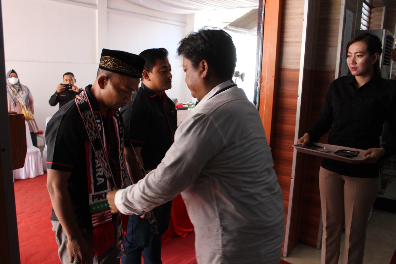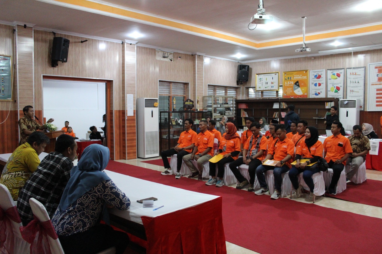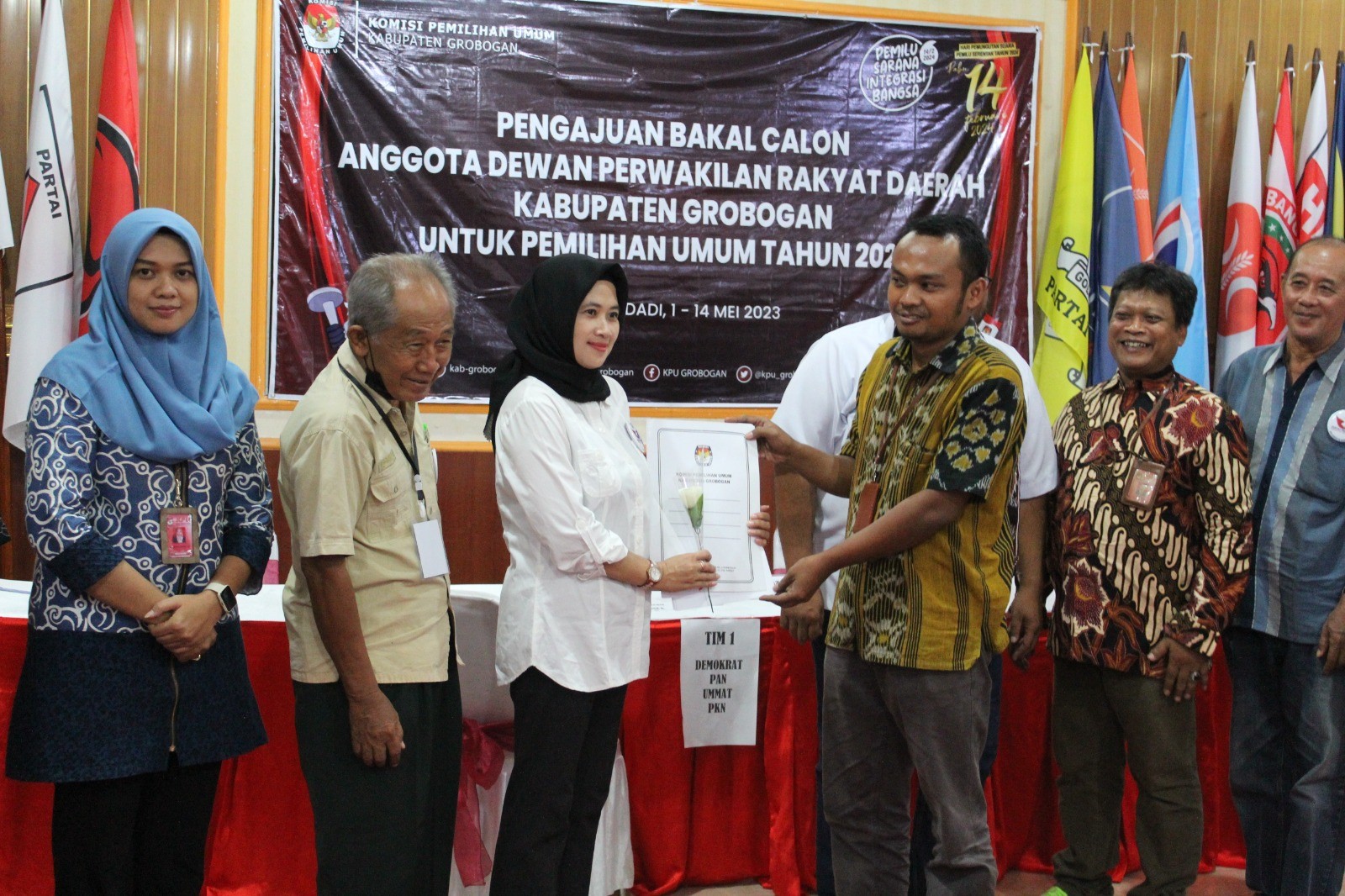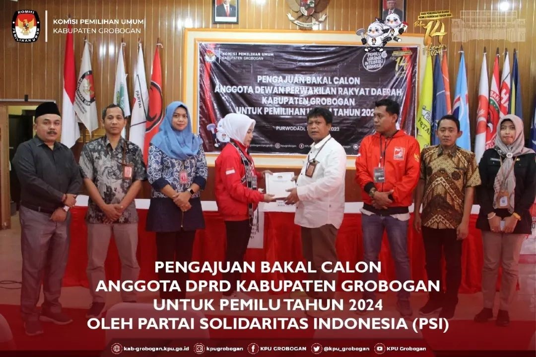PURWODADI - Minggu, 14 Mei 2023 pukul 15.49 WIB, Partai Persatuan Indonesia (Perindo) datang ke kantor KPU Kabupaten Grobogan dengan membawa berkas pengajuan bakal calon Anggota DPRD Kabupaten yang sebelumnya telah diunggah di Sistem Informasi Pencalonan (SILON). Hadir pada saat itu adalah Ketua Partai Perindo tingkat Kabupaten Grobogan Bapak G. Wahyu H. bersama Petugas Penghubung (LO) Perindo bapak Djoko Leewo M. . Kehadiran Partai Perindo diterima dengan hangat oleh Ketua KPU Kabupaten Grobogan. Setelah menyematkan cindera mata, Agung Sutopo, secara resmi menyambut rombongan Partai Perindo. Berkesempatan menyambut rombongan Partai Perindo adalah Anggota KPU Kabupaten Grobogan Divisi Teknis Penyelenggaraan Suwiknyo S.Pd. I. Dalam sambutannya, Suwiknyo mengucapkan apresiasi kepada Partai Perindo karena telah berhasil menyelesaikan tahapan pendaftaran pengajuan bakal calon Anggota DPRD Kabupaten, beliau juga berharap semoga tahapan ini bisa berjalan lancar hingga penetapan DCT. Sementara Wahyu berharap, dengan proses pengajuan bakal calon Anggota DPRD ini Partai Perindo dapat turut serta meramaikan pesta demokrasi yang akan digelar tahun 2024 mendatang, tak lupa Wahyu mengucapkan terimakasih kepada KPU Kabupaten Grobogan atas penyambutan yang dilakukan. Setelah dokumen pengajuan bakal calon Anggota DPRD Kabupaten Grobogan diterima oleh Ketua KPU Kabupaten Grobogan, untuk kemudian dilakukan pemeriksaan, dan dinyatakan lengkap. Berita Acara dan Tanda Terima Penerimaan Berkas Pengajuan diserahkan oleh Suwiknyo, kepada Sekretaris Partai Perindo tingkat Kabupaten Grobogan.