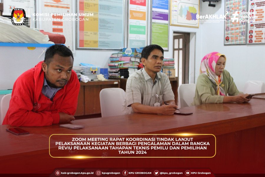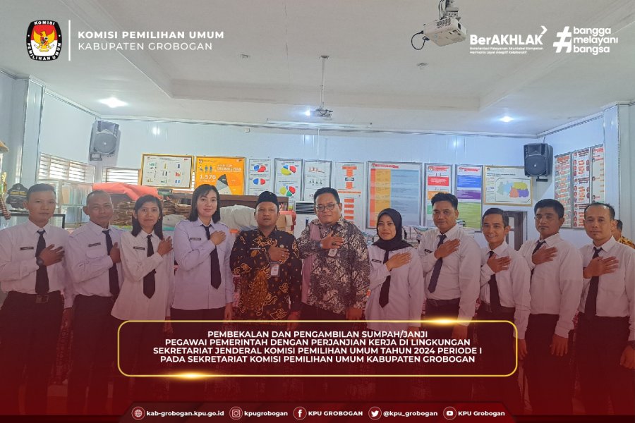 #TemanPemilih, dalam rangka menindaklanjuti surat Sekretaris Jenderal KPU Nomor 626/SDM.02-Und/04/2025 tanggal 22 Mei 2025 perihal Undangan, KPU Kabupaten Grobogan mengikuti kegiatan Pembekalan dan Pengambilan Sumpah/Janji Pegawai Pemerintah dengan Perjanjian Kerja (PPPK) di Lingkungan Sekretariat Jenderal Komisi Pemilihan Umum Tahun 2024 Periode I pada Sekretariat Komisi Pemilihan Umum Kabupaten Grobogan, Jum'at (23/5/2025). Kegiatan yang diikuti secara daring ini bertempat di Aula Kantor KPU Kabupaten Grobogan dan diikuti oleh 9 Calon PPPK Tahun 2024 Periode I dan dihadiri oleh Sekretaris beserta jajaran Sekretariat KPU Kabupaten Grobogan. Pembekalan diawali arahan dari Ibu Yuli Hertaty selaku Kepala Biro SDM KPU RI yang kemudian dilanjutkan pengarahan dari Kepala Biro SDM Badan Kepegawaian Negara. Arahan juga disampaikan oleh Kepala Bagian Kinerja dan Kesejahteraan Pegawai SDM KPU RI Bapak Riki Arantes yang menyampaikan mengenai disiplin ASN. Pelaksanaan pengambilan sumpah/janji oleh Sekretaris Jenderal KPU RI, Bapak Bernad Dermawan Sutrisno. Dalam arahannya beliau menyampaikan apresiasi dan ucapan selamat kepada para PPPK yang baru dilantik dan diharapkan untuk bekerja dengan penuh integritas, profesionalisme, serta menjunjung tinggi norma dan peraturan yang berlaku.